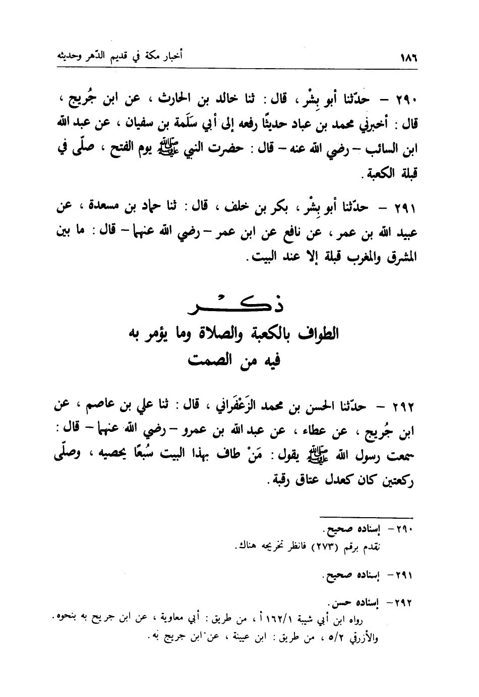 290 - حَدَّثَنَا أَبُو بِشْرٍ قَالَ: ثنا خَالِدُ بْنُ الْحَارِثِ، عَنِ ابْنِ جُرَيْجٍ قَالَ: أَخْبَرَنِي مُحَمَّدُ بْنُ عَبَّادٍ، حَدِيثًا رَفَعَهُ إِلَى أَبِي سَلَمَةَ بْنِ سُفْيَانَ عَنْ عَبْدِ اللهِ بْنِ السَّائِبِ رَضِيَ اللهُ عَنْهُ قَالَ: " حَضَرْتُ النَّبِيَّ صَلَّى اللَّهُ عَلَيْهِ وَسَلَّمَ §يَوْمَ الْفَتْحِ صَلَّى فِي قِبْلَةِ الْكَعْبَةِ "