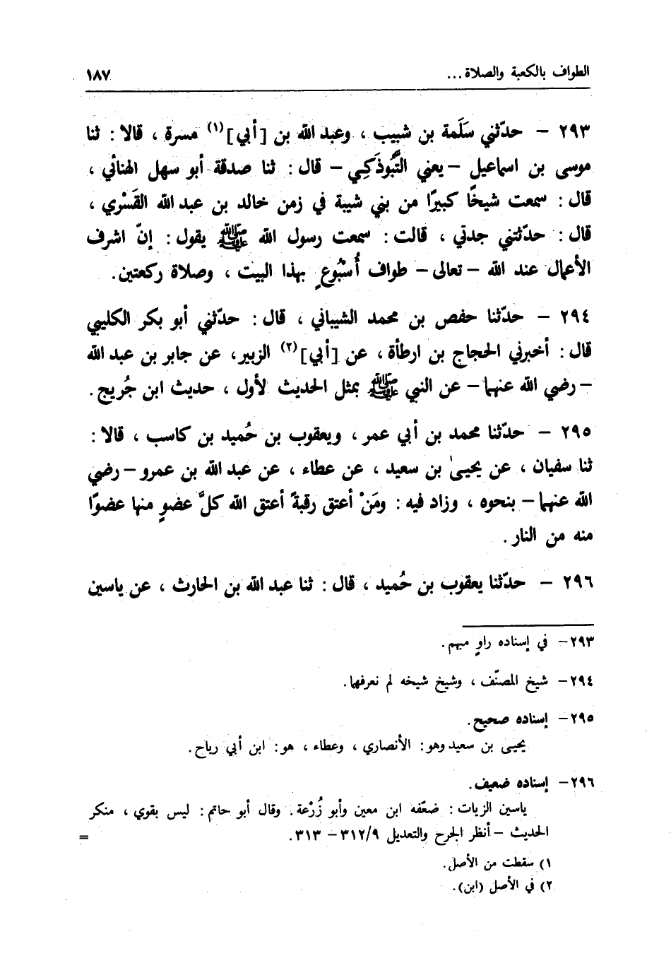 296 - حَدَّثَنَا يَعْقُوبُ بْنُ حُمَيْدٍ قَالَ: ثنا عَبْدُ اللهِ بْنُ الْحَارِثِ، عَنْ -[188]- يَاسِينَ الزَّيَّاتِ، عَنْ عَبْدِ اللهِ بْنِ عَبْدِ اللهِ، عَنْ عَمِّهِ، عَنِ ابْنِ عُمَرَ رَضِيَ اللهُ عَنْهُمَا أَنَّهُ سَمِعَ النَّبِيَّ صَلَّى اللَّهُ عَلَيْهِ وَسَلَّمَ يَقُولُ: " §مَنْ طَافَ بِالْبَيْتِ سَبْعًا فَأَحْصَاهُ، وَرَكَعَ رَكْعَتَيْنِ كَانَ كَعَدْلِ رَقَبَةٍ نَفِيسَةٍ مِنَ الرِّقَابِ "