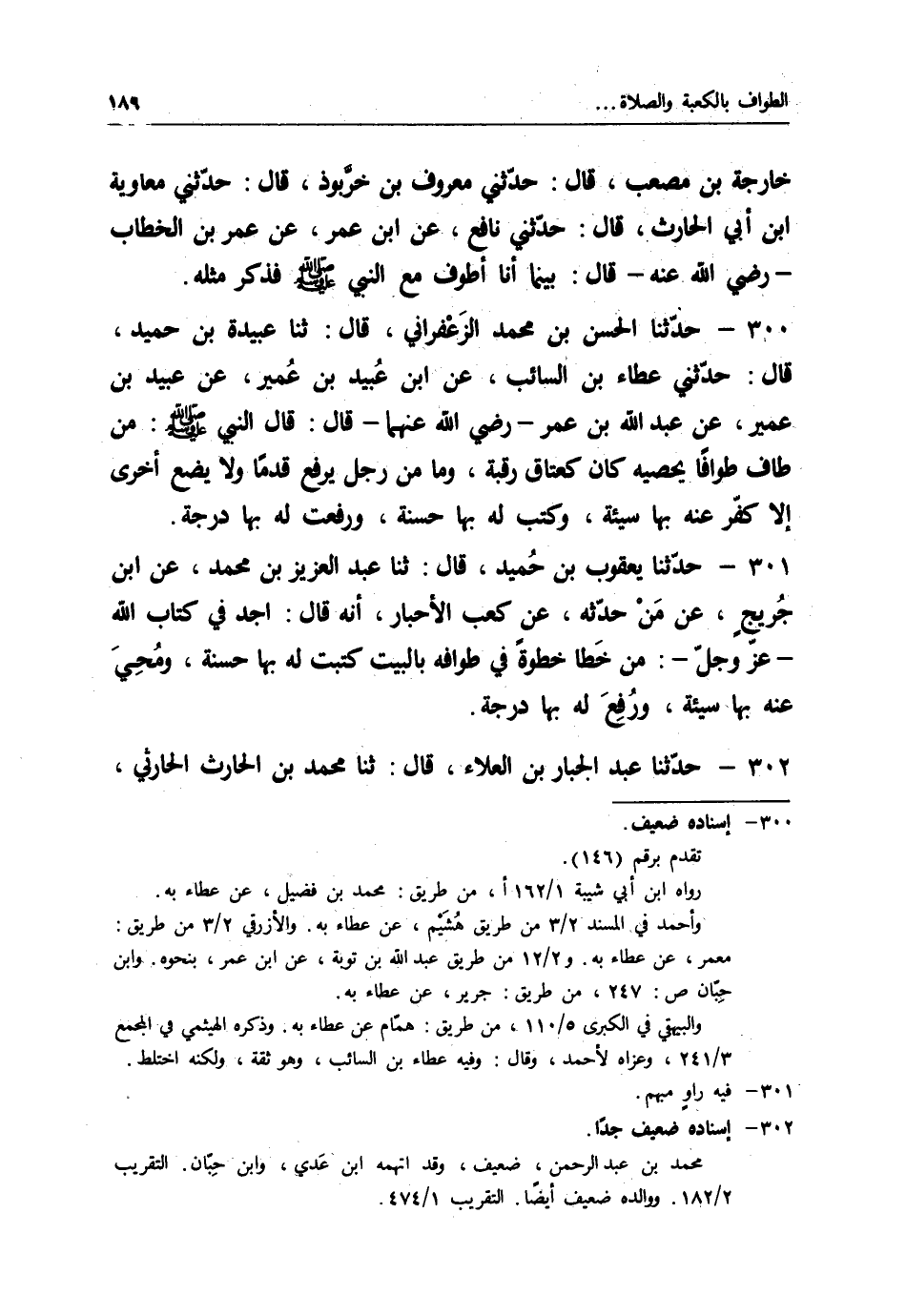 300 - حَدَّثَنَا الْحَسَنُ بْنُ مُحَمَّدٍ الزَّعْفَرَانِيُّ قَالَ: ثنا عَبِيدَةُ بْنُ حُمَيْدٍ قَالَ: حَدَّثَنِي عَطَاءُ بْنُ السَّائِبِ، عَنِ ابْنِ عُبَيْدِ بْنِ عُمَيْرٍ، عَنْ عُبَيْدِ بْنِ عُمَيْرٍ، عَنْ عَبْدِ اللهِ بْنِ عُمَرَ رَضِيَ اللهُ عَنْهُمَا قَالَ: قَالَ النَّبِيُّ صَلَّى اللَّهُ عَلَيْهِ وَسَلَّمَ: " §مَنْ طَافَ طَوَافًا يُحْصِيهِ كَانَ كَعِتَاقِ رَقَبَةٍ، وَمَا مِنْ رَجُلٍ يَرْفَعُ قَدَمًا وَلَا يَضَعُ أُخْرَى إِلَّا كُفِّرَ عَنْهُ بِهَا سَيِّئَةٌ، وَكُتِبَ لَهُ بِهَا حَسَنَةٌ، وَرُفِعَتْ لَهُ بِهَا دَرَجَةٌ "