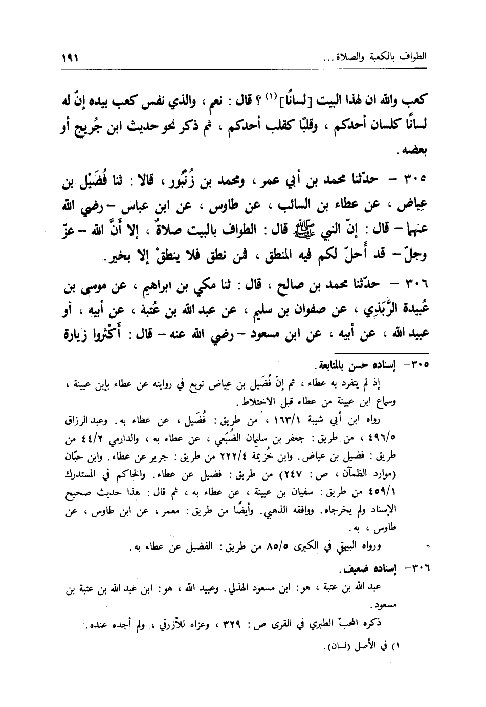 305 - حَدَّثَنَا مُحَمَّدُ بْنُ أَبِي عُمَرَ، وَمُحَمَّدُ بْنُ زُنْبُورٍ، قَالَا: ثنا فُضَيْلُ بْنُ عِيَاضٍ، عَنْ عَطَاءِ بْنِ السَّائِبِ، عَنْ طَاوُسٍ، عَنِ ابْنِ عَبَّاسٍ رَضِيَ اللهُ عَنْهُمَا قَالَ: إِنَّ النَّبِيَّ صَلَّى اللَّهُ عَلَيْهِ وَسَلَّمَ قَالَ: " §الطَّوَافُ بِالْبَيْتِ صَلَاةٌ إِلَّا أَنَّ اللهَ عَزَّ وَجَلَّ قَدْ أَحَلَّ لَكُمْ فِيهِ الْمَنْطِقَ، فَمَنْ نَطَقَ فَلَا يَنْطِقْ إِلَّا بِخَيْرٍ "