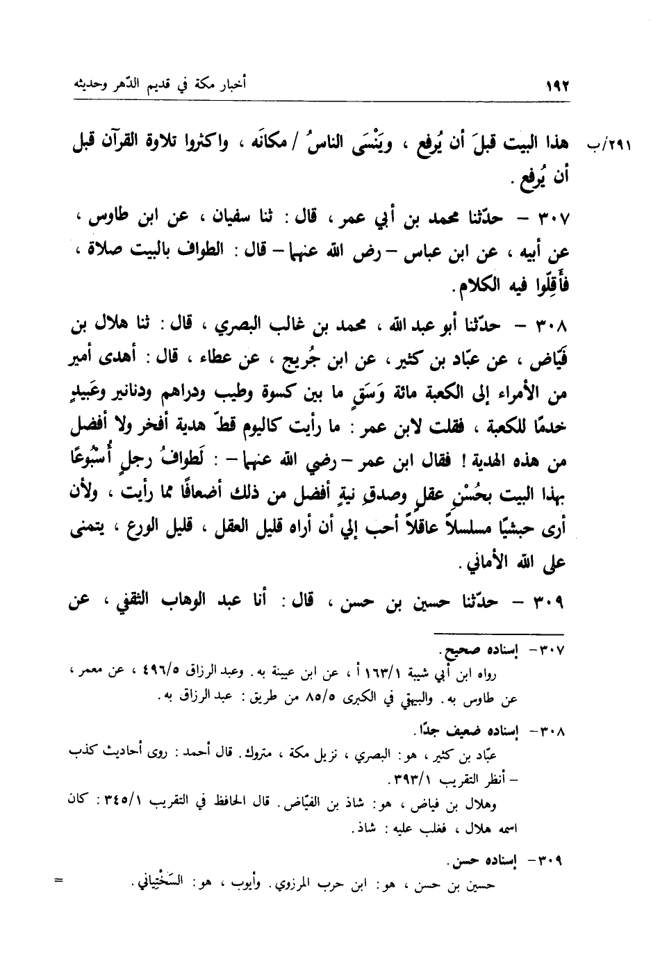307 - حَدَّثَنَا مُحَمَّدُ بْنُ أَبِي عُمَرَ قَالَ: ثنا سُفْيَانُ، عَنِ ابْنِ طَاوُسٍ، عَنْ أَبِيهِ، عَنِ ابْنِ عَبَّاسٍ رَضِيَ اللهُ عَنْهُمَا قَالَ: " §الطَّوَافُ بِالْبَيْتِ صَلَاةٌ، فَأَقِلُّوا فِيهِ الْكَلَامَ "