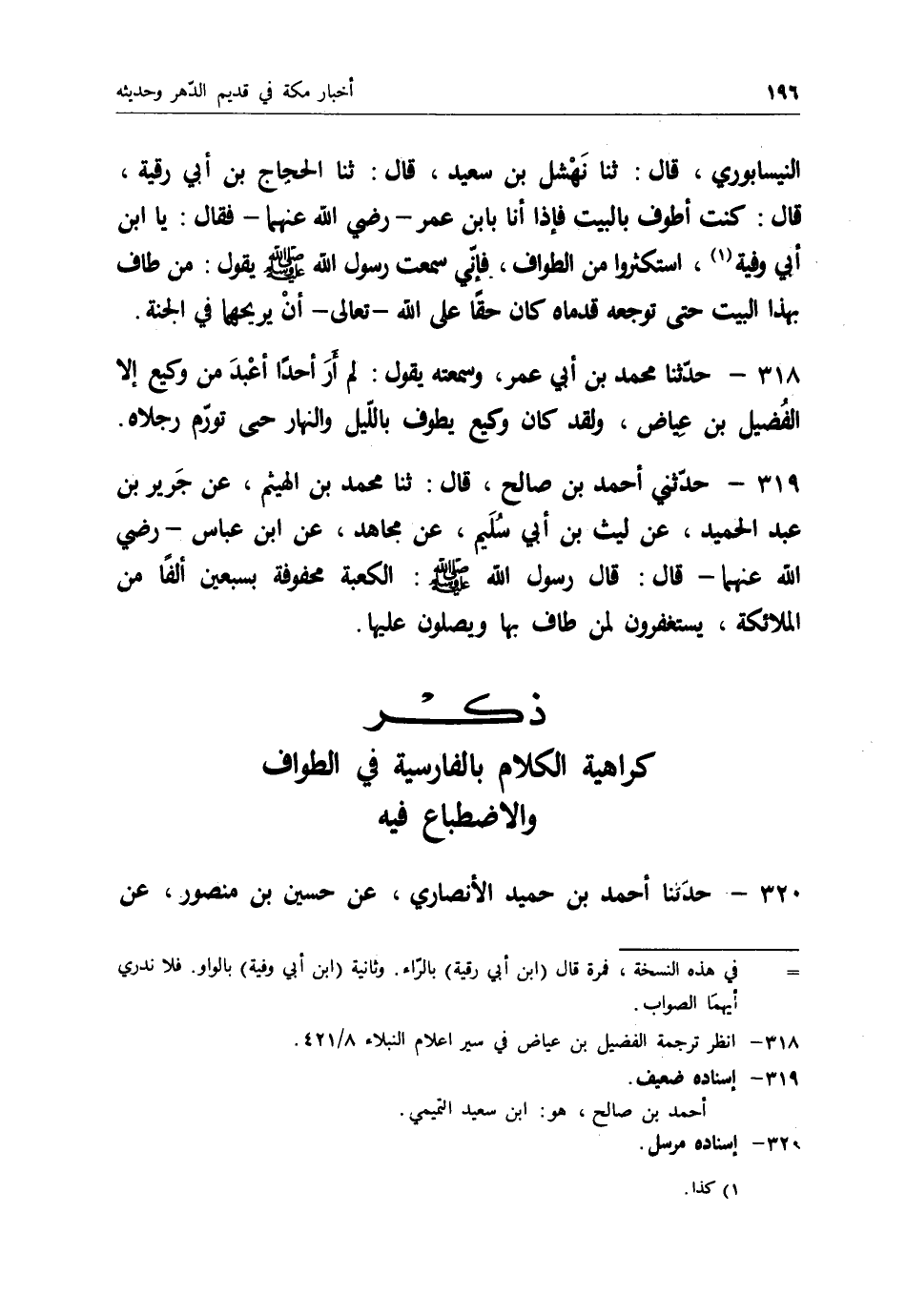 320 - حَدَّثَنَا أَحْمَدُ بْنُ حُمَيْدٍ الْأَنْصَارِيُّ، عَنْ حُسَيْنِ بْنِ مَنْصُورٍ، عَنْ -[197]- أَحْمَدَ بْنِ إِبْرَاهِيمَ بْنِ طُعْمَةَ، عَنْ سَعِيدِ بْنِ عَبْدِ الْعَزِيزِ، عَنْ مَكْحُولٍ قَالَ: " §نَهَى رَسُولُ اللهِ صَلَّى اللَّهُ عَلَيْهِ وَسَلَّمَ أَنْ يُتَكَلَّمَ بِالْفَارِسِيَّةِ فِي الْمَسْجِدِ الْحَرَامِ "