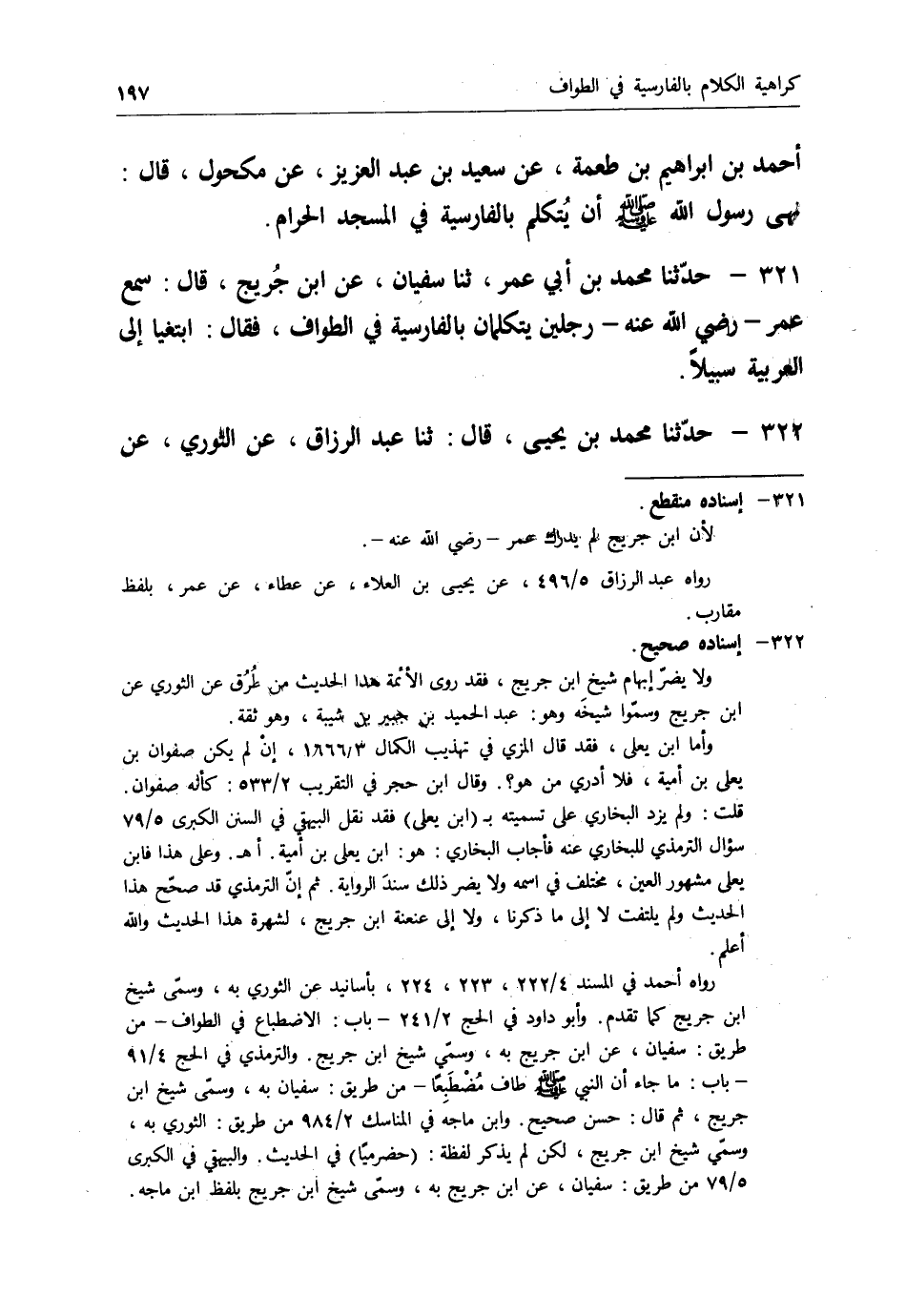 321 - حَدَّثَنَا مُحَمَّدُ بْنُ أَبِي عُمَرَ، ثنا سُفْيَانُ، عَنِ ابْنِ جُرَيْجٍ قَالَ: سَمِعَ عُمَرُ رَضِيَ اللهُ عَنْهُ رَجُلَيْنِ يَتَكَلَّمَانِ بِالْفَارِسِيَّةِ فِي الطَّوَافِ، فَقَالَ: " §ابْتَغِيَا إِلَى الْعَرَبِيَّةِ سَبِيلًا "