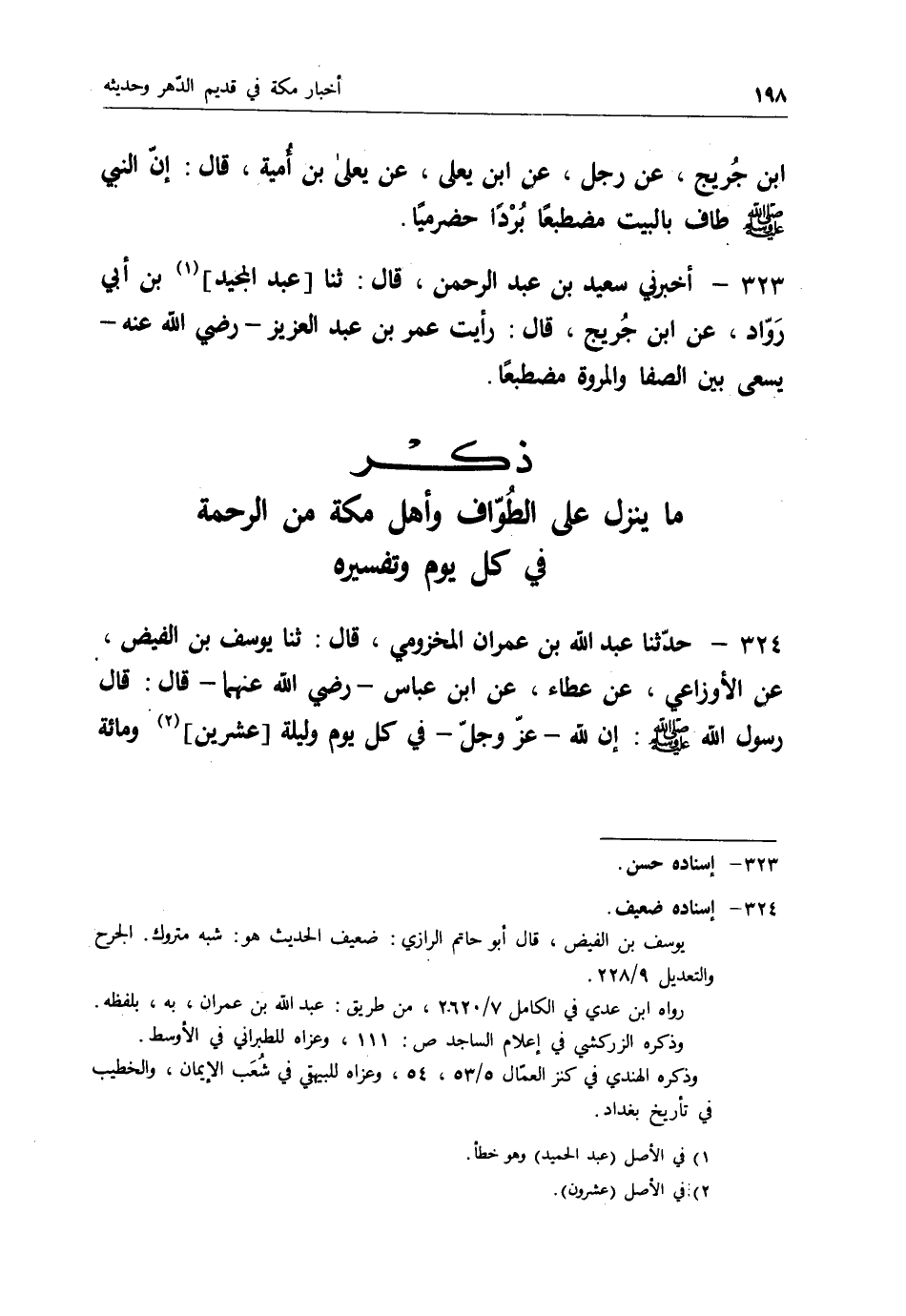 324 - حَدَّثَنَا عَبْدُ اللهِ بْنُ عِمْرَانَ الْمَخْزُومِيُّ قَالَ: ثنا يُوسُفُ بْنُ الْفَيْضِ، عَنِ الْأَوْزَاعِيِّ، عَنْ عَطَاءٍ، عَنِ ابْنِ عَبَّاسٍ رَضِيَ اللهُ عَنْهُمَا قَالَ: قَالَ رَسُولُ اللهِ صَلَّى اللَّهُ عَلَيْهِ وَسَلَّمَ: " إِنَّ لِلَّهِ عَزَّ وَجَلَّ §فِي كُلِّ يَوْمٍ وَلَيْلَةٍ عِشْرِينَ -[199]- وَمِائَةَ رَحْمَةٍ تَنْزِلُ عَلَى هَذَا الْبَيْتِ، فَسِتُّونَ لِلطَّائِفِينَ، وَأَرْبَعُونَ لِلرَّاكِعِينَ، وَعِشْرُونَ لِلنَّاظِرِينَ "