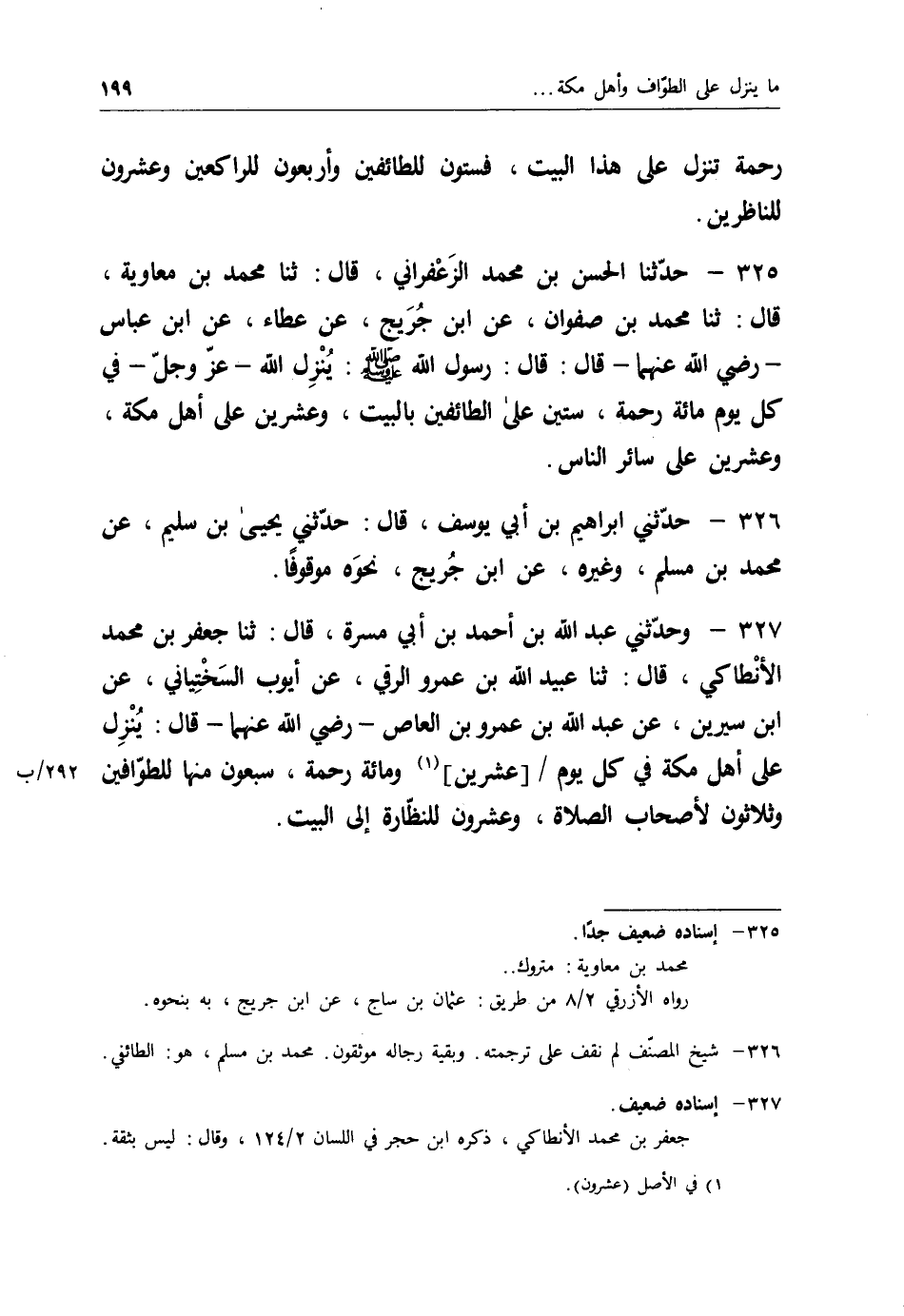 327 - وَحَدَّثَنِي عَبْدُ اللهِ بْنُ أَحْمَدَ بْنِ أَبِي مَسَرَّةَ قَالَ: ثنا جَعْفَرُ بْنُ مُحَمَّدٍ الْأَنْطَاكِيُّ قَالَ: ثنا عُبَيْدُ اللهِ بْنُ عَمْرٍو الرَّقِّيُّ، عَنْ أَيُّوبَ السَّخْتِيَانِيِّ، عَنِ ابْنِ سِيرِينَ، عَنْ عَبْدِ اللهِ بْنِ عَمْرِو بْنِ الْعَاصِ رَضِيَ اللهُ عَنْهُمَا قَالَ: " §يُنَزَّلُ عَلَى أَهْلِ مَكَّةَ فِي كُلِّ يَوْمٍ عِشْرُونَ وَمِائَةُ رَحْمَةٍ، سَبْعُونَ مِنْهَا لِلطَّوَّافِينَ، وَثَلَاثُونَ لِأَصْحَابِ الصَّلَاةِ، وَعِشْرُونَ لِلنَّظَّارَةِ إِلَى الْبَيْتِ "