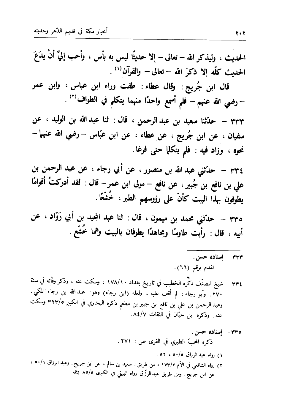 335 - حَدَّثَنِي مُحَمَّدُ بْنُ مَيْمُونٍ قَالَ: ثنا عَبْدُ الْمَجِيدِ بْنُ أَبِي رَوَّادٍ، عَنْ أَبِيهِ قَالَ: " رَأَيْتُ طَاوُسًا وَمُجَاهِدًا §يَطُوفَانِ بِالْبَيْتِ وَهُمَا خُشَّعٌ "