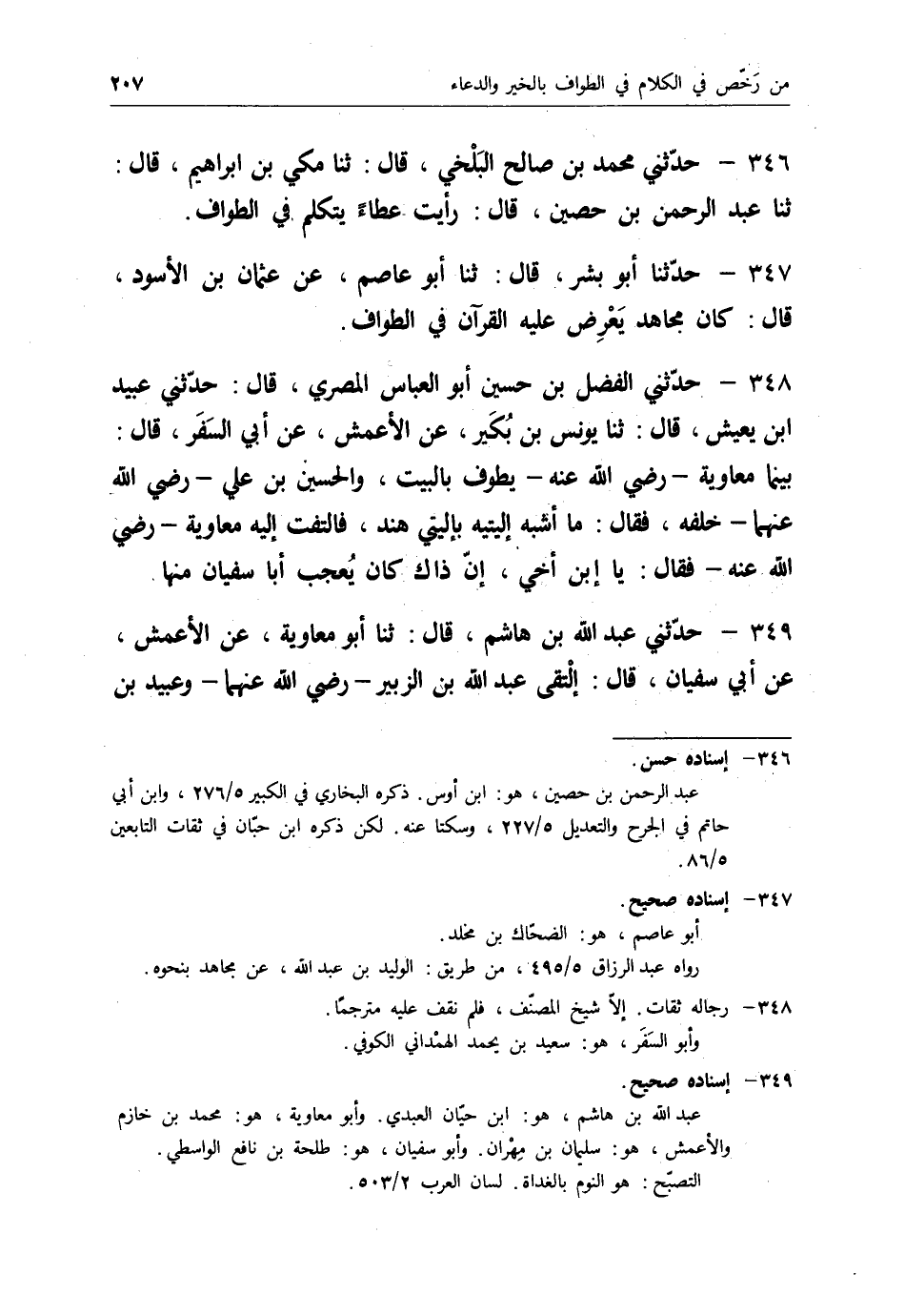 346 - حَدَّثَنِي مُحَمَّدُ بْنُ صَالِحٍ الْبَلْخِيُّ قَالَ: ثنا مَكِّيُّ بْنُ إِبْرَاهِيمَ قَالَ: ثنا عَبْدُ الرَّحْمَنِ بْنُ حُصَيْنٍ قَالَ: " §رَأَيْتُ عَطَاءً يَتَكَلَّمُ فِي الطَّوَافِ "