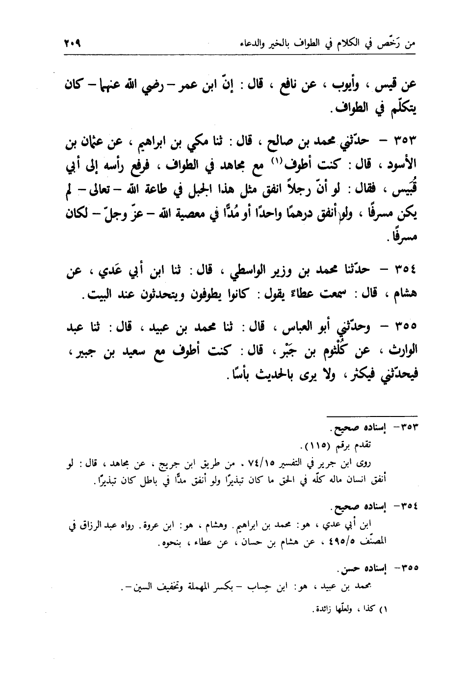 353 - حَدَّثَنِي مُحَمَّدُ بْنُ صَالِحٍ قَالَ: ثنا مَكِّيُّ بْنُ إِبْرَاهِيمَ، عَنْ عُثْمَانَ بْنِ الْأَسْوَدِ قَالَ: كُنْتُ أَطُوفُ مَعَ مُجَاهِدٍ فِي الطَّوَافِ فَرَفَعَ رَأْسَهُ إِلَى أَبِي قُبَيْسٍ َقَالَ: " §لَوْ أَنَّ رَجُلًا أَنْفَقَ مِثْلَ هَذَا الْجَبَلِ فِي طَاعَةِ اللهِ تَعَالَى لَمْ يَكُنْ مُسْرِفًا، وَلَوْ أَنْفَقَ دِرْهَمًا وَاحِدًا أَوْ مُدًّا فِي مَعْصِيَةِ اللهِ عَزَّ وَجَلَّ لَكَانَ مُسْرِفًا "