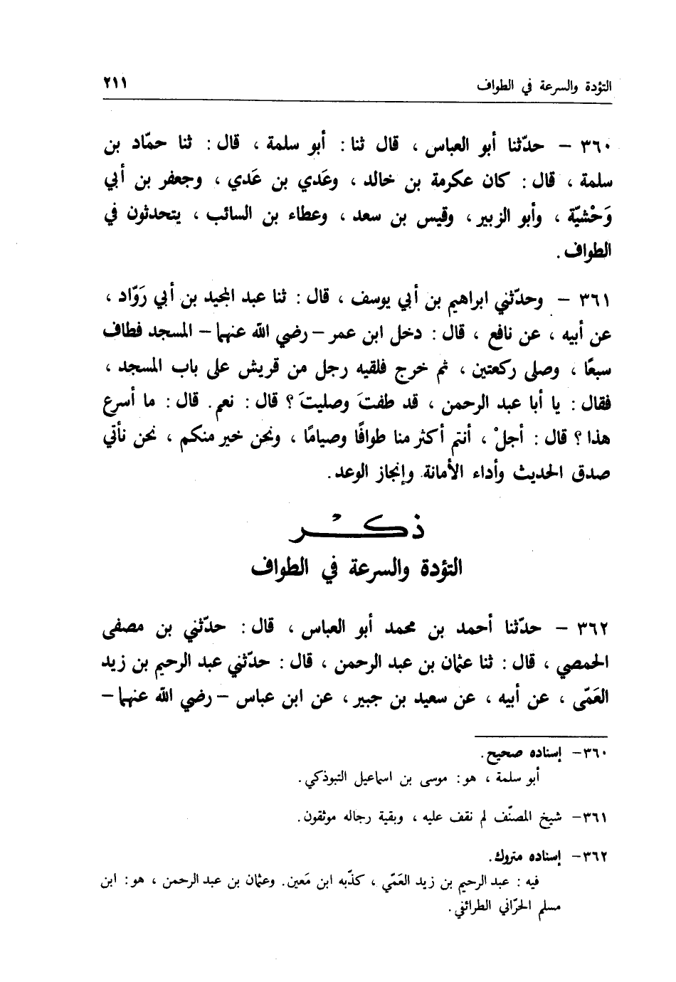 360 - حَدَّثَنَا أَبُو الْعَبَّاسِ قَالَ: ثنا أَبُو سَلَمَةَ قَالَ: ثنا حَمَّادُ بْنُ سَلَمَةَ قَالَ: " كَانَ عِكْرِمَةُ بْنُ خَالِدٍ وَعَدِيُّ بْنُ عَدِيٍّ وَجَعْفَرُ بْنُ أَبِي وَحْشِيَّةَ، وَأَبُو الزُّبَيْرِ، وَقَيْسُ بْنُ سَعْدٍ، وَعَطَاءُ بْنُ السَّائِبِ §يَتَحَدَّثُونَ فِي الطَّوَافِ "