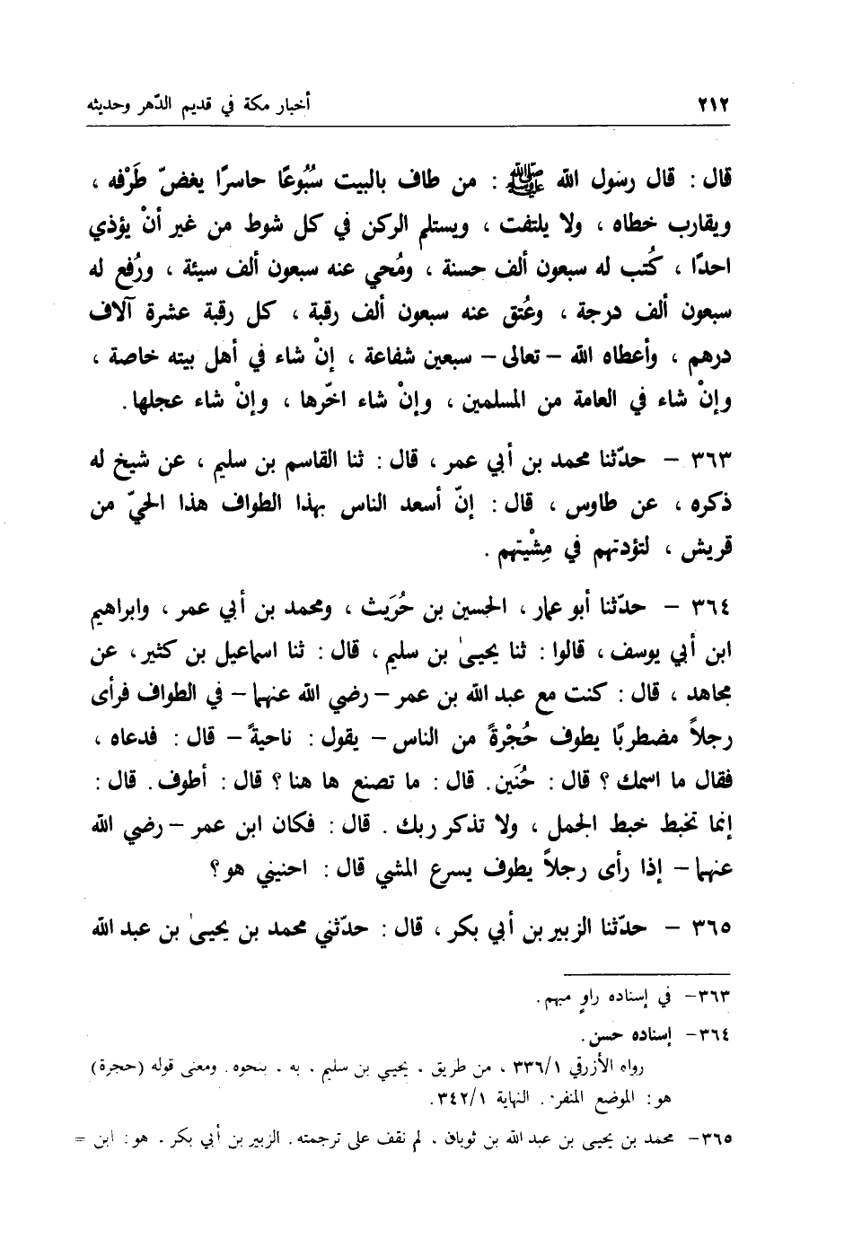 363 - حَدَّثَنَا مُحَمَّدُ بْنُ أَبِي عُمَرَ قَالَ: ثنا الْقَاسِمُ بْنُ سُلَيْمٍ، عَنْ شَيْخٍ لَهُ ذَكَرَهُ، عَنْ طَاوُسٍ قَالَ: " إِنَّ §أَسْعَدَ النَّاسِ بِهَذَا الطَّوَافِ هَذَا الْحَيُّ مِنْ قُرَيْشِ لِتُؤَدَتِهِمْ فِي مِشْيَتِهِمْ "