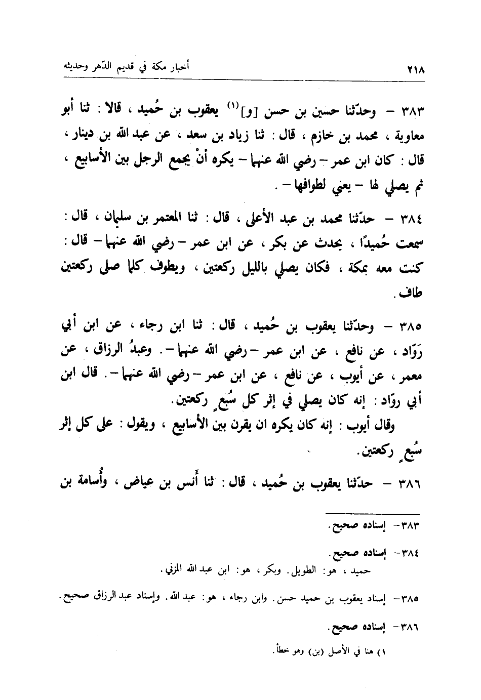 383 - وَحَدَّثَنَا حُسَيْنُ بْنُ حَسَنٍ، وَيَعْقُوبُ بْنُ حُمَيْدٍ، قَالَا: ثنا أَبُو مُعَاوِيَةَ مُحَمَّدُ بْنُ خَازِمٍ قَالَ: ثنا زِيَادُ بْنُ سَعْدٍ، عَنْ عَبْدِ اللهِ بْنِ دِينَارٍ قَالَ: " كَانَ ابْنُ عُمَرَ رَضِيَ اللهُ عَنْهُمَا §يَكْرَهُ أَنْ يَجْمَعَ الرَّجُلُ بَيْنَ الْأَسَابِيعِ ثُمَّ يُصَلِّي لَهَا " يَعْنِي لِطَوَافِهَا