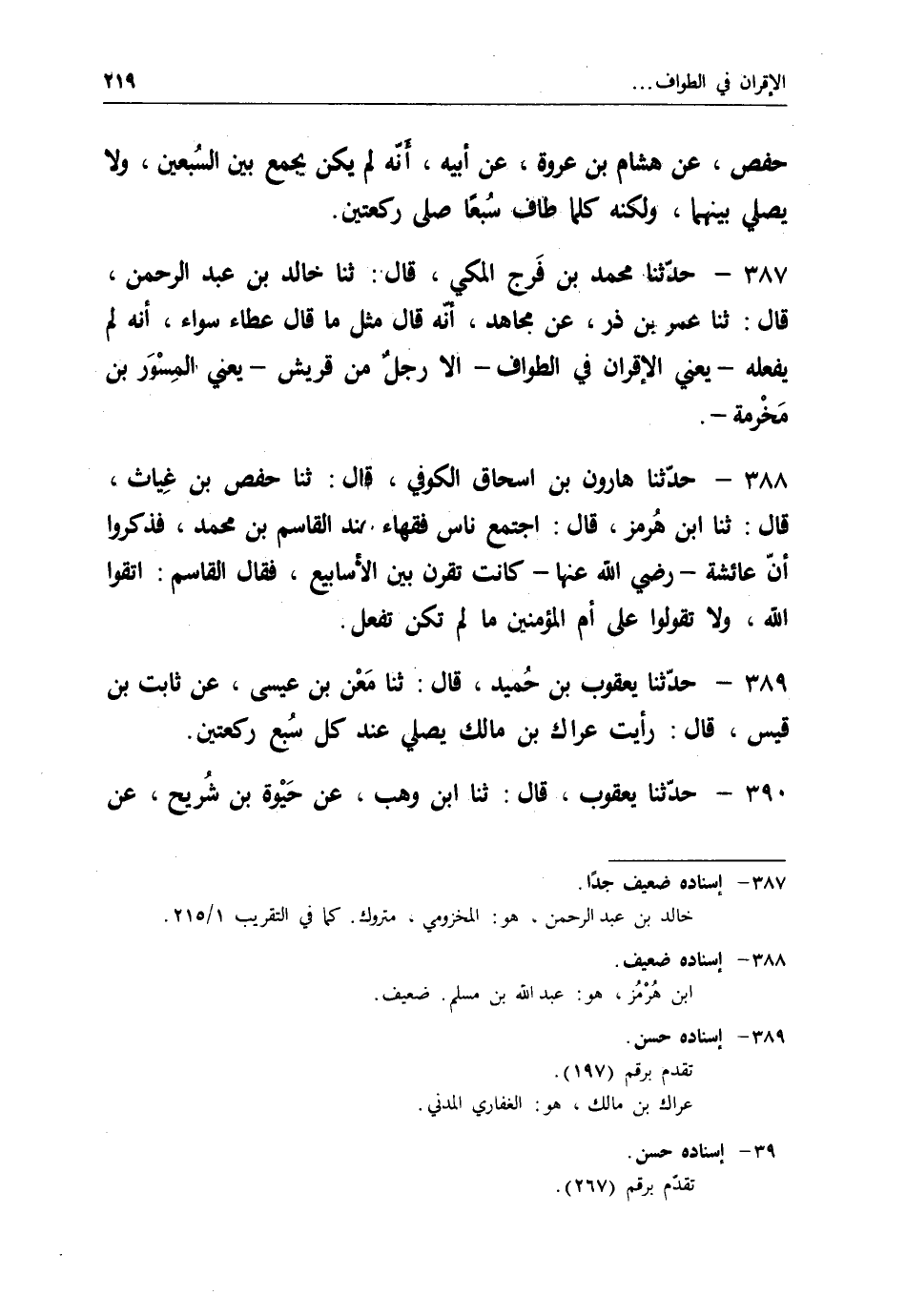 387 - حَدَّثَنَا مُحَمَّدُ بْنُ فَرَجٍ الْمَكِّيُّ قَالَ: ثنا خَالِدُ بْنُ عَبْدِ الرَّحْمَنِ قَالَ: ثنا عُمَرُ بْنُ ذَرٍّ، عَنْ مُجَاهِدٍ، أَنَّهُ قَالَ مِثْلَ مَا قَالَ عَطَاءٌ سَوَاءً، أَنَّهُ " §لَمْ يَفْعَلْهُ، يَعْنِي الْإِقْرَانَ، فِي الطَّوَافِ إِلَّا رَجُلٌ مِنْ قُرَيْشٍ، يَعْنِي الْمِسْوَرَ بْنَ مَخْرَمَةَ "