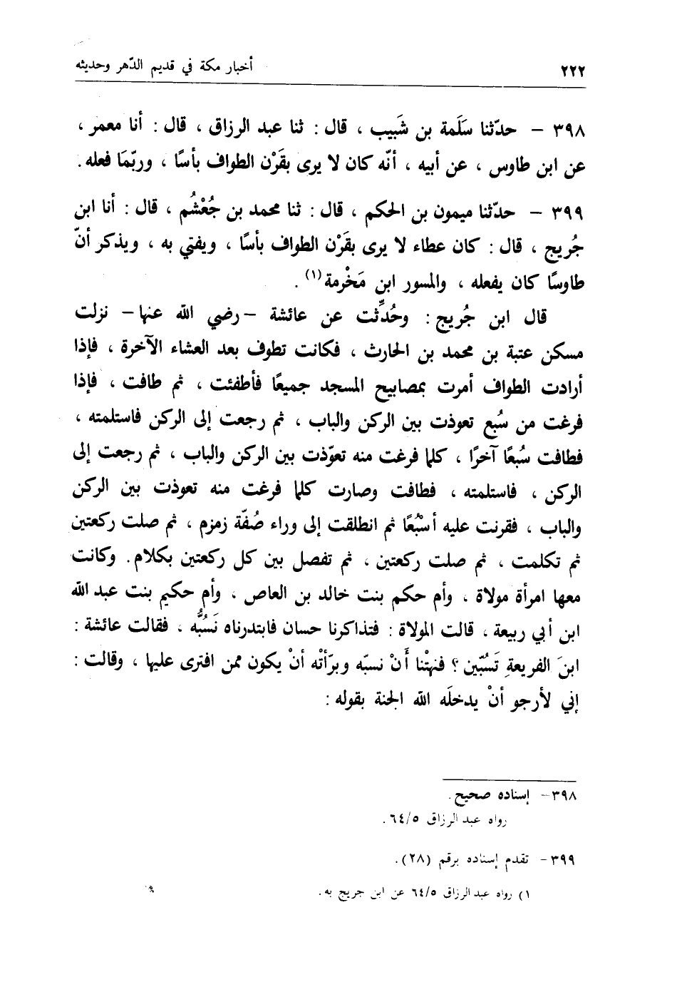 قَالَ ابْنُ جُرَيْجٍ: وَحُدِّثْتُ عَنْ عَائِشَةَ رَضِيَ اللهُ عَنْهَا: نَزَلَتْ مَسْكَنَ عُتْبَةَ بْنِ مُحَمَّدِ بْنِ الْحَارِثِ فَكَانَتْ §تَطُوفُ بَعْدَ الْعِشَاءِ الْآخِرَةِ، فَإِذَا أَرَادَتِ الطَّوَافَ أَمَرَتْ بِمَصَابِيحِ الْمَسْجِدِ جَمِيعًا فَأُطْفِئَتْ، ثُمَّ طَافَتْ، فَإِذَا فَرَغَتْ مِنْ سَبْعٍ تَعَوَّذَتْ بَيْنَ الرُّكْنِ وَالْبَابِ ثُمَّ رَجَعَتْ إِلَى الرُّكْنِ فَاسْتَلَمَتْهُ فَطَافَتْ سَبْعًا آخَرَ، كُلَّمَا فَرَغَتْ مِنْهُ تَعَوَّذَتْ بَيْنَ الرُّكْنِ وَالْبَابِ ثُمَّ رَجَعَتْ إِلَى الرُّكْنِ فَاسْتَلَمَتْهُ فَطَافَتْ، وَصَارَتْ كُلَّمَا فَرَغَتْ مِنْهُ تَعَوَّذَتْ بَيْنَ الرُّكْنِ وَالْبَابِ، فَقَرَنَتْ عَلَيْهِ أَسْبُعًا ثُمَّ انْطَلَقَتْ إِلَى وَرَاءِ صُفَّةِ زَمْزَمَ ثُمَّ صَلَّتْ رَكْعَتَيْنِ، ثُمَّ تَكَلَّمَتْ، ثُمَّ صَلَّتْ رَكْعَتَيْنِ، ثُمَّ تَفْصِلُ بَيْنَ كُلِّ رَكْعَتَيْنِ بِكَلَامٍ، وَكَانَتْ مَعَهَا امْرَأَةٌ مَوْلَاةٌ وَأُمُّ حَكَمٍ بِنْتُ خَالِدِ بْنِ الْعَاصِ وَأُمُّ حَكِيمٍ بِنْتُ عَبْدِ اللهِ بْنِ أَبِي رَبِيعَةَ قَالَتِ الْمَوْلَاةُ: فَتَذَاكَرْنَا حَسَّانَ فَابْتَدَرْنَاهُ نَسُبُّهُ، فَقَالَتْ عَائِشَةُ: " ابْنَ الْفُرَيْعَةِ تَسُبِّينَ " فَنَهَتْنَا أَنْ نَسُبَّهُ، وَبَرَّأَتْهُ أَنْ يَكُونَ مِمَّنْ افْتَرَى عَلَيْهَا، وَقَالَتْ: " إِنِّي لَأَرْجُو أَنْ يُدْخِلَهَ اللهُ الْجَنَّةَ بِقَوْلِهِ: