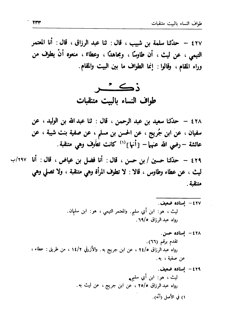 427 - حَدَّثَنَا سَلَمَةُ بْنُ شَبِيبٍ قَالَ: ثنا عَبْدُ الرَّزَّاقِ قَالَ: أَنَا الْمُعْتَمِرُ التَّيْمِيُّ، عَنْ لَيْثٍ: أَنَّ طَاوُسًا، وَمُجَاهِدًا، وَعَطَاءً مَنَعُوهُ أَنْ يَطُوفَ مِنْ وَرَاءِ الْمَقَامِ وَقَالُوا: " إِنَّمَا §الطَّوَافُ مَا بَيْنَ الْبَيْتِ وَالْمَقَامِ "
