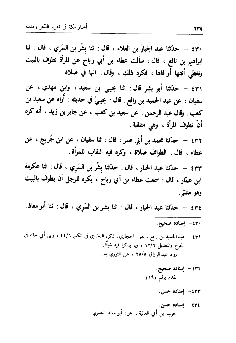 431 - حَدَّثَنَا أَبُو بِشْرٍ قَالَ: ثنا يَحْيَى بْنُ سَعِيدٍ، وَابْنُ مَهْدِيٍّ، عَنْ سُفْيَانَ، عَنْ عَبْدِ الْحَمِيدِ بْنِ رَافِعٍ، قَالَ يَحْيَى فِي حَدِيثِهِ: أُرَاهُ عَنْ سَعِيدِ بْنِ كَعْبٍ، وَقَالَ عَبْدُ الرَّحْمَنِ، عَنْ سَعِيدِ بْنِ كَعْبٍ، عَنْ جَابِرِ بْنِ زَيْدٍ: أَنَّهُ " §كَرِهَ أَنْ تَطُوفَ الْمَرْأَةُ، وَهِيَ مُتَنَقِّبَةٌ "