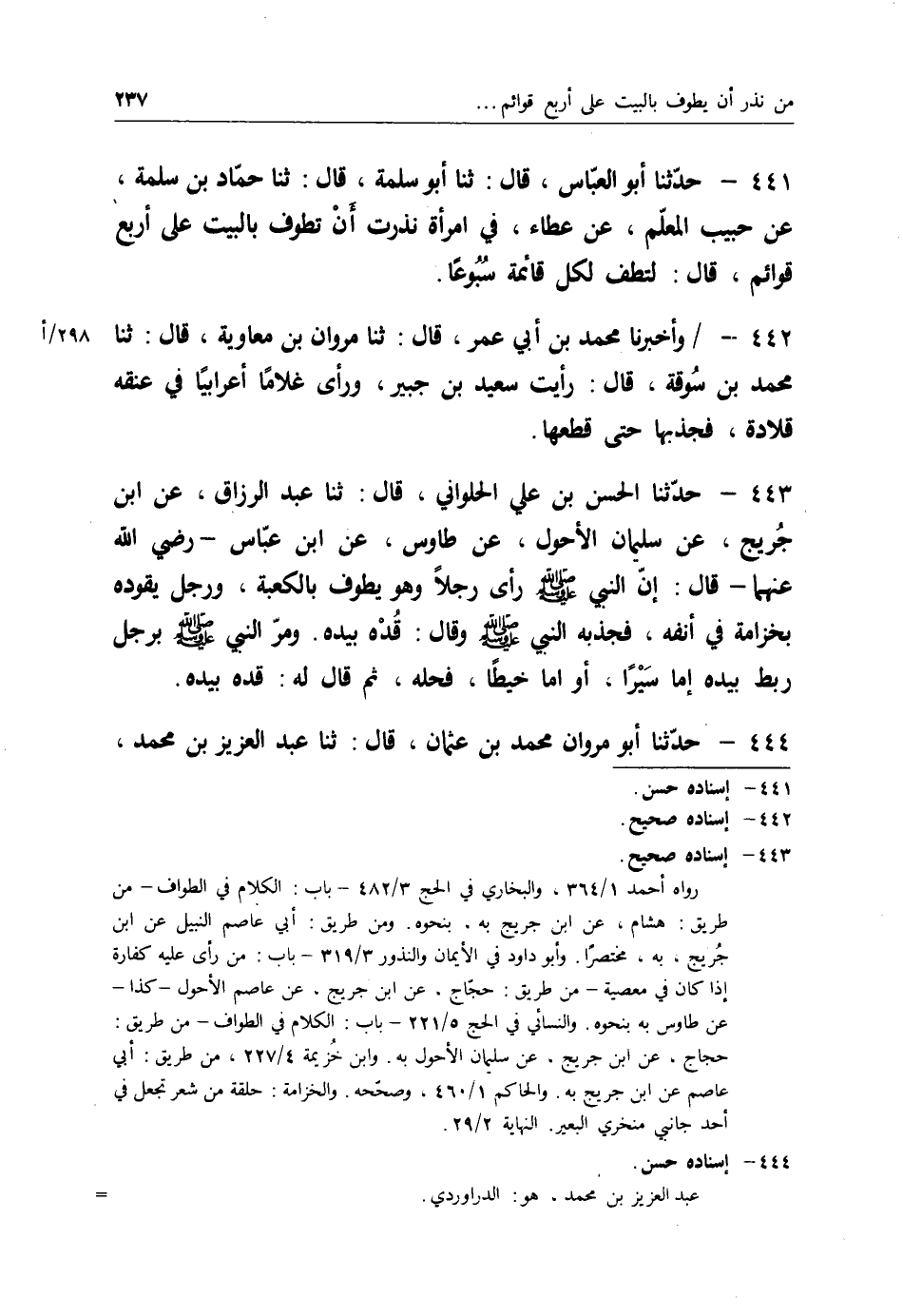 443 - حَدَّثَنَا الْحَسَنُ بْنُ عَلِيٍّ الْحُلْوَانِيُّ قَالَ: ثنا عَبْدُ الرَّزَّاقِ، عَنِ ابْنِ جُرَيْجٍ، عَنْ سُلَيْمَانَ الْأَحْوَلِ، عَنْ طَاوُسٍ، عَنِ ابْنِ عَبَّاسٍ رَضِيَ اللهُ عَنْهُمَا قَالَ: إِنَّ النَّبِيَّ صَلَّى اللَّهُ عَلَيْهِ وَسَلَّمَ رَأَى رَجُلًا وَهُوَ §يَطُوفُ بِالْكَعْبَةِ، وَرَجُلٌ يَقُودُهُ بِخِزَامَةٍ فِي أَنْفِهِ، فَجَذَبَهُ النَّبِيُّ صَلَّى اللَّهُ عَلَيْهِ وَسَلَّمَ وَقَالَ: " قُدْهُ بِيَدِهِ " وَمَرَّ النَّبِيُّ صَلَّى اللَّهُ عَلَيْهِ وَسَلَّمَ بِرَجُلٍ رَبَطَ بِيَدِهِ إِمَّا سَيْرًا أَوْ إِمَّا خَيْطًا، فَحَلَّهُ ثُمَّ قَالَ لَهُ: " قُدْهُ بِيَدِهِ "