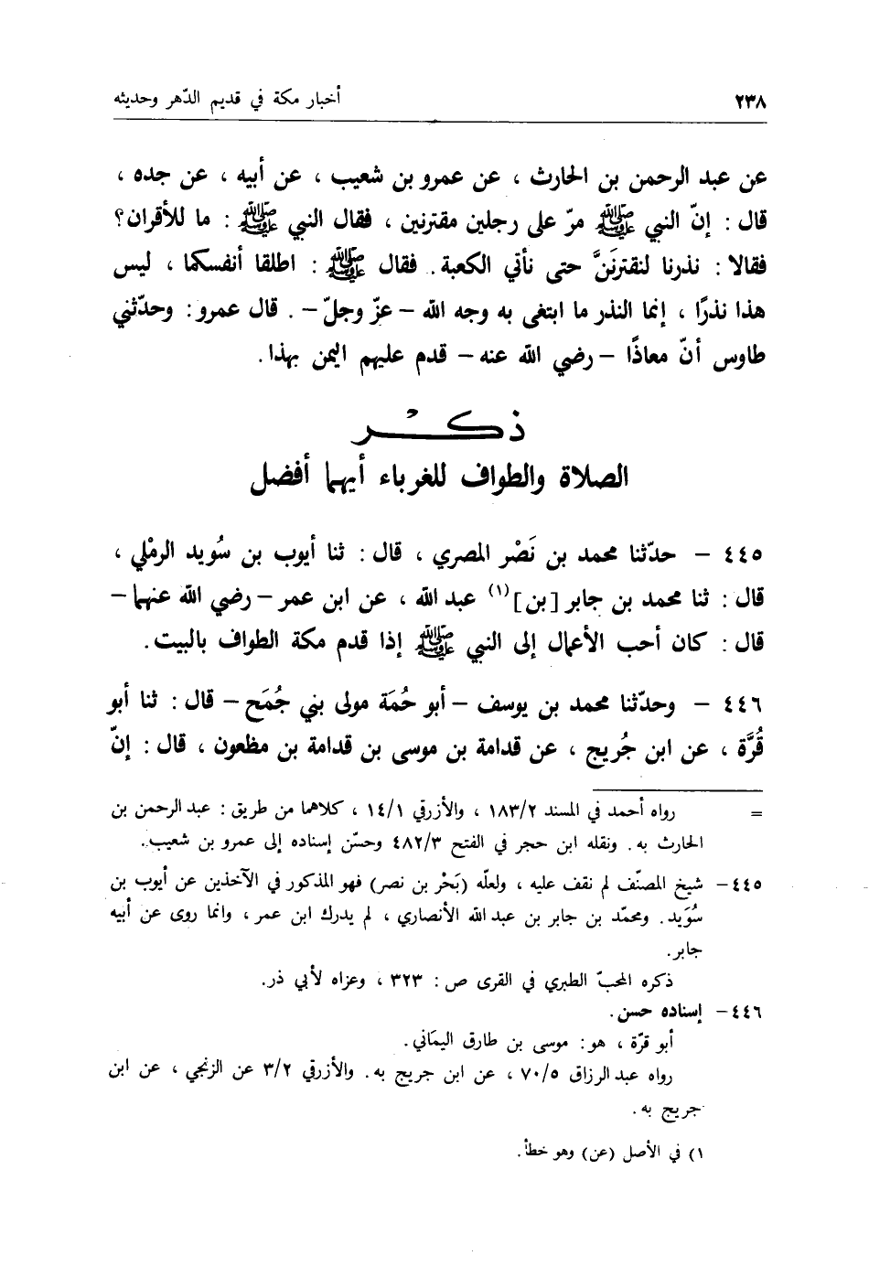 445 - حَدَّثَنَا مُحَمَّدُ بْنُ نَصْرٍ الْمِصْرِيُّ قَالَ: ثنا أَيُّوبُ بْنُ سُوَيْدٍ الرَّمْلِيُّ قَالَ: ثنا مُحَمَّدُ بْنُ جَابِرِ بْنِ عَبْدِ اللهِ، عَنِ ابْنِ عُمَرَ رَضِيَ اللهُ عَنْهُمَا قَالَ: " كَانَ §أَحَبَّ الْأَعْمَالِ إِلَى النَّبِيِّ صَلَّى اللَّهُ عَلَيْهِ وَسَلَّمَ إِذَا قَدِمَ مَكَّةَ الطَّوَافُ بِالْبَيْتِ "