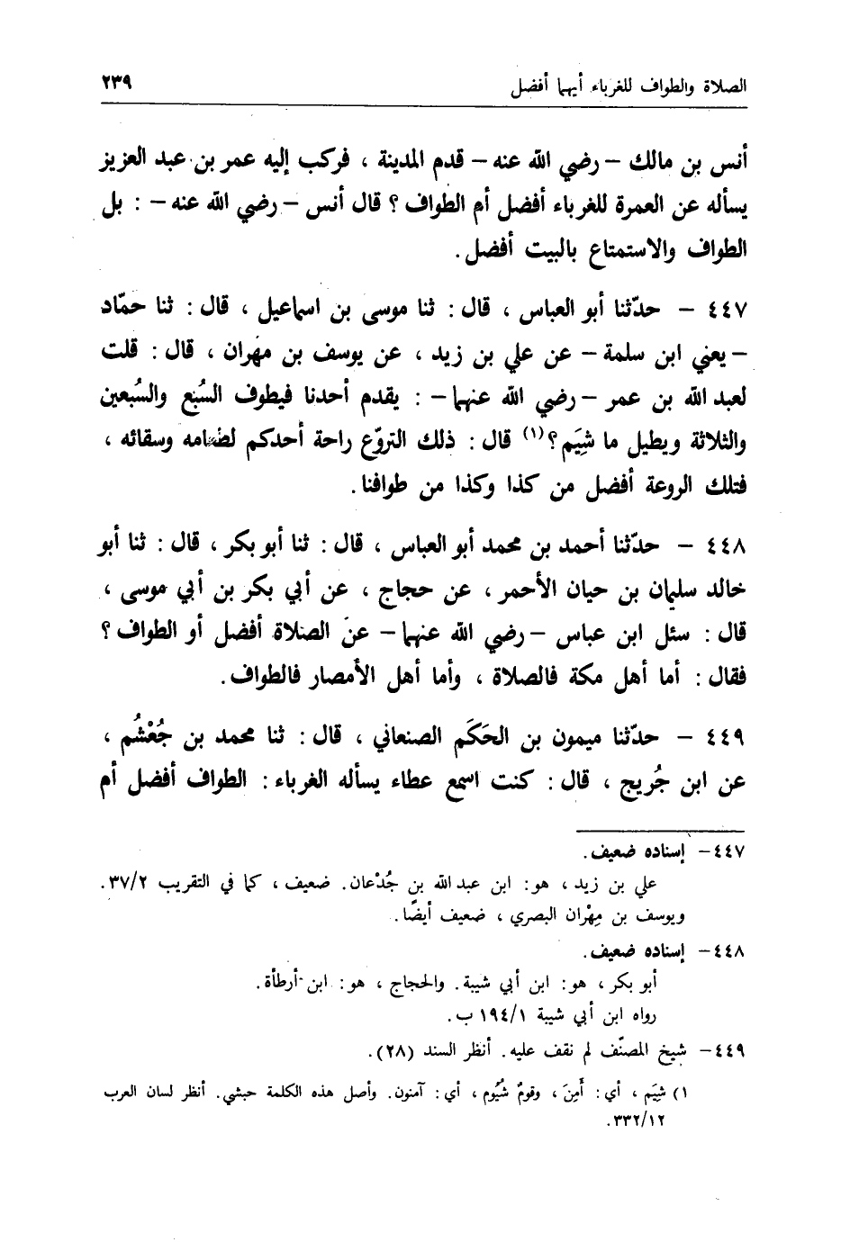 449 - حَدَّثَنَا مَيْمُونُ بْنُ الْحَكَمِ الصَّنْعَانِيُّ قَالَ: ثنا مُحَمَّدُ بْنُ جُعْشُمٍ، عَنِ ابْنِ جُرَيْجٍ قَالَ: كُنْتُ أَسْمَعُ عَطَاءً يَسْأَلُهُ الْغُرَبَاءُ: §الطَّوَافُ أَفْضَلُ أَمِ الصَّلَاةُ؟ فَيَقُولُ: " أَمَّا لَكُمْ - لِلْغُرَبَاءِ - فَالطَّوَافُ أَفْضَلُ؛ لِأَنَّكُمْ لَا تَقْدِرُونَ عَلَى الطَّوَافِ بِأَرْضِكُمْ وَأَنْتُمْ تَقْدِرُونَ هُنَالِكَ -[240]- عَلَى الصَّلَاةِ " قَالَ ابْنُ جُرَيْجٍ: وَأُخْبِرْتُ عَنْ أَنَسِ بْنِ مَالِكٍ رَضِيَ اللهُ عَنْهُ أَنَّهُ قَدِمَ الْمَدِينَةَ فَكَتَبَ إِلَيْهِ عُمَرُ بْنُ عَبْدِ الْعَزِيزِ، فَذَكَرَ نَحْوَ حَدِيثِ أَبِي قُرَّةَ