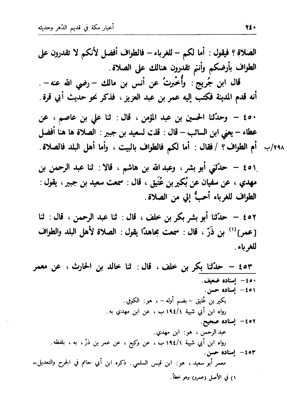 451 - حَدَّثَنِي أَبُو بِشْرٍ، وَعَبْدُ اللهِ بْنُ هَاشِمٍ، قَالَا: ثنا عَبْدُ الرَّحْمَنِ بْنُ مَهْدِيٍّ، عَنْ سُفْيَانَ، عَنْ بُكَيْرِ بْنِ عَتِيقٍ قَالَ: سَمِعْتُ سَعِيدَ بْنَ جُبَيْرٍ، يَقُولُ: " §الطَّوَافُ لِلْغُرَبَاءِ أَحَبُّ إِلَيَّ مِنَ الصَّلَاةِ "