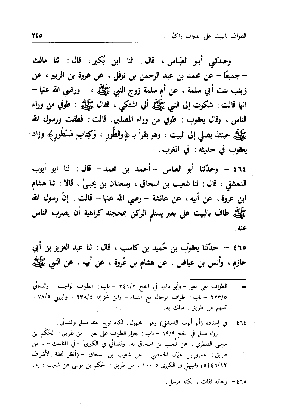 464 - وَحَدَّثَنَا أَبُو الْعَبَّاسِ أَحْمَدُ بْنُ مُحَمَّدٍ قَالَ: ثنا أَبُو أَيُّوبَ الدِّمَشْقِيُّ قَالَ: ثنا شُعَيْبُ بْنُ إِسْحَاقَ، وَسَعْدَانُ بْنُ يَحْيَى، قَالَا: ثنا هِشَامُ بْنُ عُرْوَةَ، عَنْ أَبِيهِ، عَنْ عَائِشَةَ رَضِيَ اللهُ عَنْهَا، قَالَتْ: إِنَّ رَسُولَ اللهِ صَلَّى اللَّهُ عَلَيْهِ وَسَلَّمَ " §طَافَ بِالْبَيْتِ عَلَى بَعِيرٍ يَسْتَلِمُ الرُّكْنَ بِمِحْجَنِهِ كَرَاهِيَةَ أَنْ يُضْرِبَ النَّاسُ عَنْهُ "