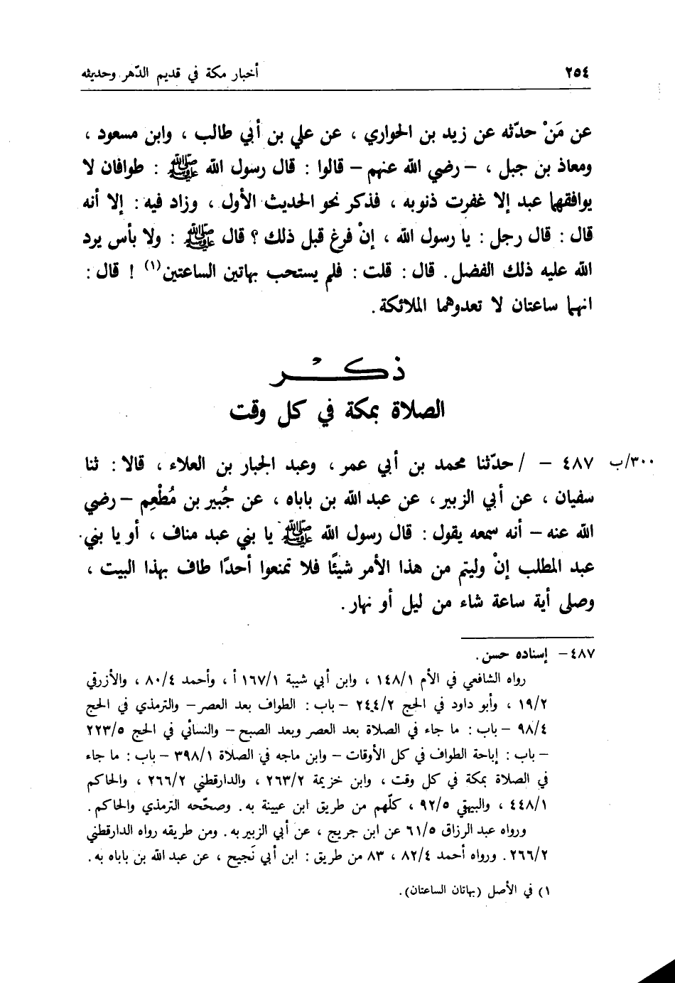 487 - حَدَّثَنَا مُحَمَّدُ بْنُ أَبِي عُمَرَ، وَعَبْدُ الْجَبَّارِ بْنُ الْعَلَاءِ، قَالَا: ثنا سُفْيَانُ، عَنْ أَبِي الزُّبَيْرِ، عَنْ عَبْدِ اللهِ بْنِ بَابَاهْ، عَنْ جُبَيْرِ بْنِ مُطْعِمٍ رَضِيَ اللهُ عَنْهُ أَنَّهُ سَمِعَهُ يَقُولُ: قَالَ رَسُولُ اللهِ صَلَّى اللَّهُ عَلَيْهِ وَسَلَّمَ: " يَا بَنِي عَبْدِ مَنَافٍ، أَوْ يَا بَنِي عَبْدِ الْمُطَّلِبِ §إِنْ وُلِّيتُمْ مِنْ هَذَا الْأَمْرِ شَيْئًا فَلَا تَمْنَعُوا أَحَدًا طَافَ بِهَذَا الْبَيْتِ وَصَلَّى أَيَّةَ سَاعَةٍ شَاءَ مِنْ لَيْلٍ أَوْ نَهَارٍ " -[255]-
