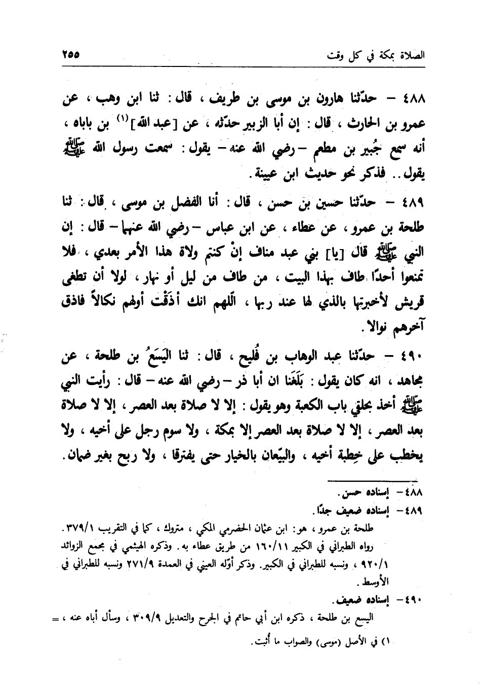 489 - حَدَّثَنَا حُسَيْنُ بْنُ حَسَنٍ قَالَ: أَنَا الْفَضْلُ بْنُ مُوسَى قَالَ: ثنا طَلْحَةُ بْنُ عَمْرٍو، عَنْ عَطَاءٍ، عَنِ ابْنِ عَبَّاسٍ رَضِيَ اللهُ عَنْهُمَا قَالَ: إِنَّ النَّبِيَّ صَلَّى اللَّهُ عَلَيْهِ وَسَلَّمَ قَالَ: " يَا بَنِي عَبْدِ مَنَافٍ، إِنْ كُنْتُمْ وُلَاةَ هَذَا الْأَمْرِ بَعْدِي §فَلَا تَمْنَعُوا أَحَدًا طَافَ بِهَذَا الْبَيْتِ، مَنْ طَافَ مِنْ لَيْلٍ أَوْ نَهَارٍ، لَوْلَا أَنْ تَطْغَى قُرَيْشٌ لَأَخْبَرْتُهَا بِالَّذِي لَهَا عِنْدَ رَبِّهَا، اللهُمَّ إِنَّكَ أَذَقْتَ أَوَّلَهُمْ نَكَالًا فَأَذِقْ آخِرَهُمْ نَوَالًا "