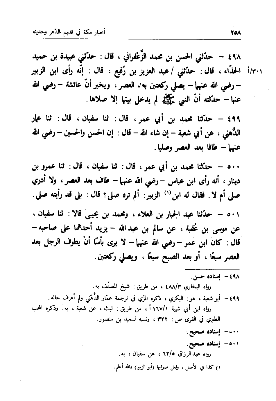 500 - حَدَّثَنَا مُحَمَّدُ بْنُ أَبِي عُمَرَ قَالَ: ثنا سُفْيَانُ قَالَ: ثنا عَمْرُو بْنُ دِينَارٍ: أَنَّهُ " رَأَى ابْنَ عَبَّاسٍ رَضِيَ اللهُ عَنْهُمَا §طَافَ بَعْدَ الْعَصْرِ، وَلَا أَدْرِي صَلَّى أَمْ لَا؟ "، فَقَالَ لَهُ ابْنُ الزُّبَيْرِ: أَلَمْ تَرَهُ صَلَّى؟ قَالَ: بَلَى قَدْ رَأَيْتُهُ صَلَّى "