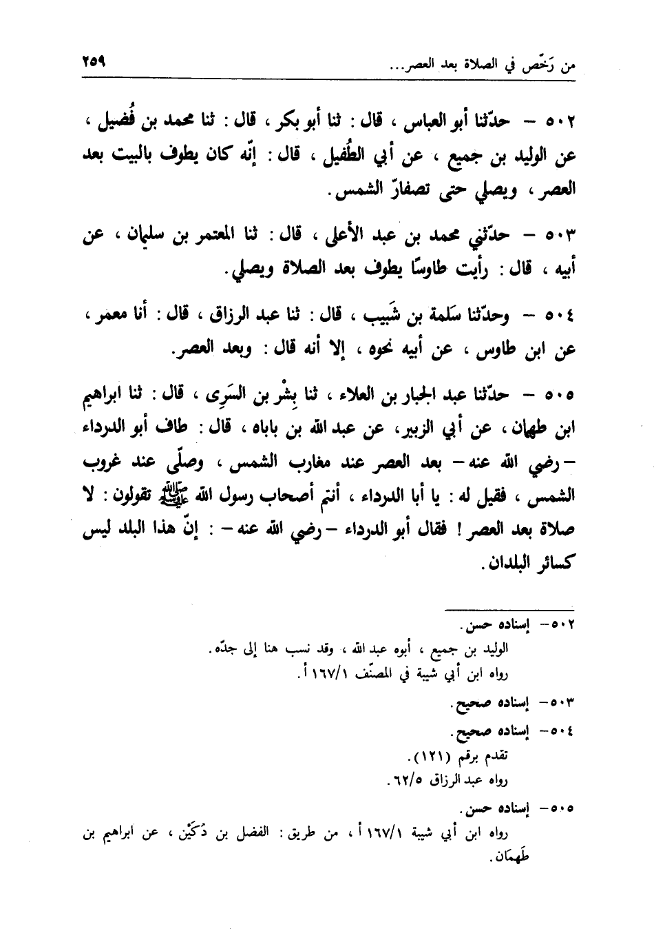 505 - حَدَّثَنَا عَبْدُ الْجَبَّارِ بْنُ الْعَلَاءِ، ثنا بِشْرُ بْنُ السَّرِيِّ قَالَ: ثنا إِبْرَاهِيمُ بْنُ طَهْمَانَ، عَنْ أَبِي الزُّبَيْرِ، عَنْ عَبْدِ اللهِ بْنِ بَابَاهْ قَالَ: طَافَ أَبُو الدَّرْدَاءِ رَضِيَ اللهُ عَنْهُ بَعْدَ الْعَصْرِ عِنْدَ مَغَارِبِ الشَّمْسِ وَصَلَّى عِنْدَ غُرُوبِ الشَّمْسِ، فَقِيلَ لَهُ: يَا أَبَا الدَّرْدَاءِ، أَنْتُمْ أَصْحَابُ رَسُولِ اللهِ صَلَّى اللَّهُ عَلَيْهِ وَسَلَّمَ، تَقُولُونَ: §لَا صَلَاةَ بَعْدَ الْعَصْرِ؟ فَقَالَ أَبُو الدَّرْدَاءِ رَضِيَ اللهُ عَنْهُ: " إِنَّ هَذَا الْبَلَدَ لَيْسَ كَسَائِرِ الْبُلْدَانِ "