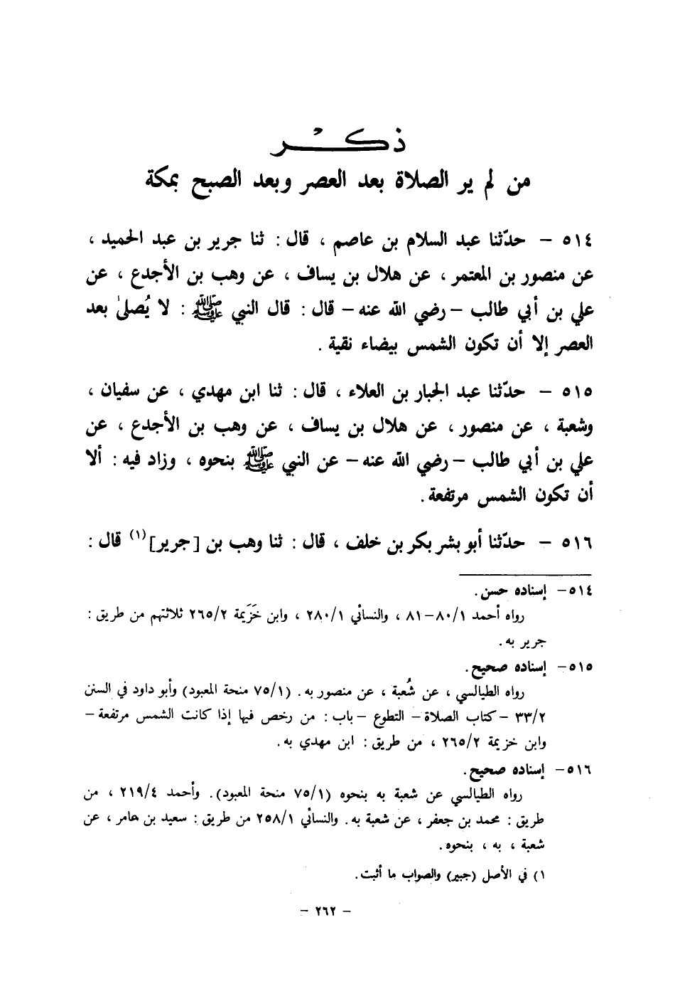 514 - حَدَّثَنَا عَبْدُ السَّلَامِ بْنُ عَاصِمٍ قَالَ: ثنا جَرِيرُ بْنُ عَبْدِ الْحَمِيدِ، عَنْ مَنْصُورِ بْنِ الْمُعْتَمِرِ، عَنْ هِلَالِ بْنِ يَسَافٍ، عَنْ وَهْبِ بْنِ الْأَجْدَعِ، عَنْ عَلِيِّ بْنِ أَبِي طَالِبٍ رَضِيَ اللهُ عَنْهُ قَالَ: قَالَ النَّبِيُّ صَلَّى اللَّهُ عَلَيْهِ وَسَلَّمَ: " §لَا يُصَلَّى بَعْدَ الْعَصْرِ إِلَّا أَنْ تَكُونَ الشَّمْسُ بَيْضَاءَ نَقِيَّةً "