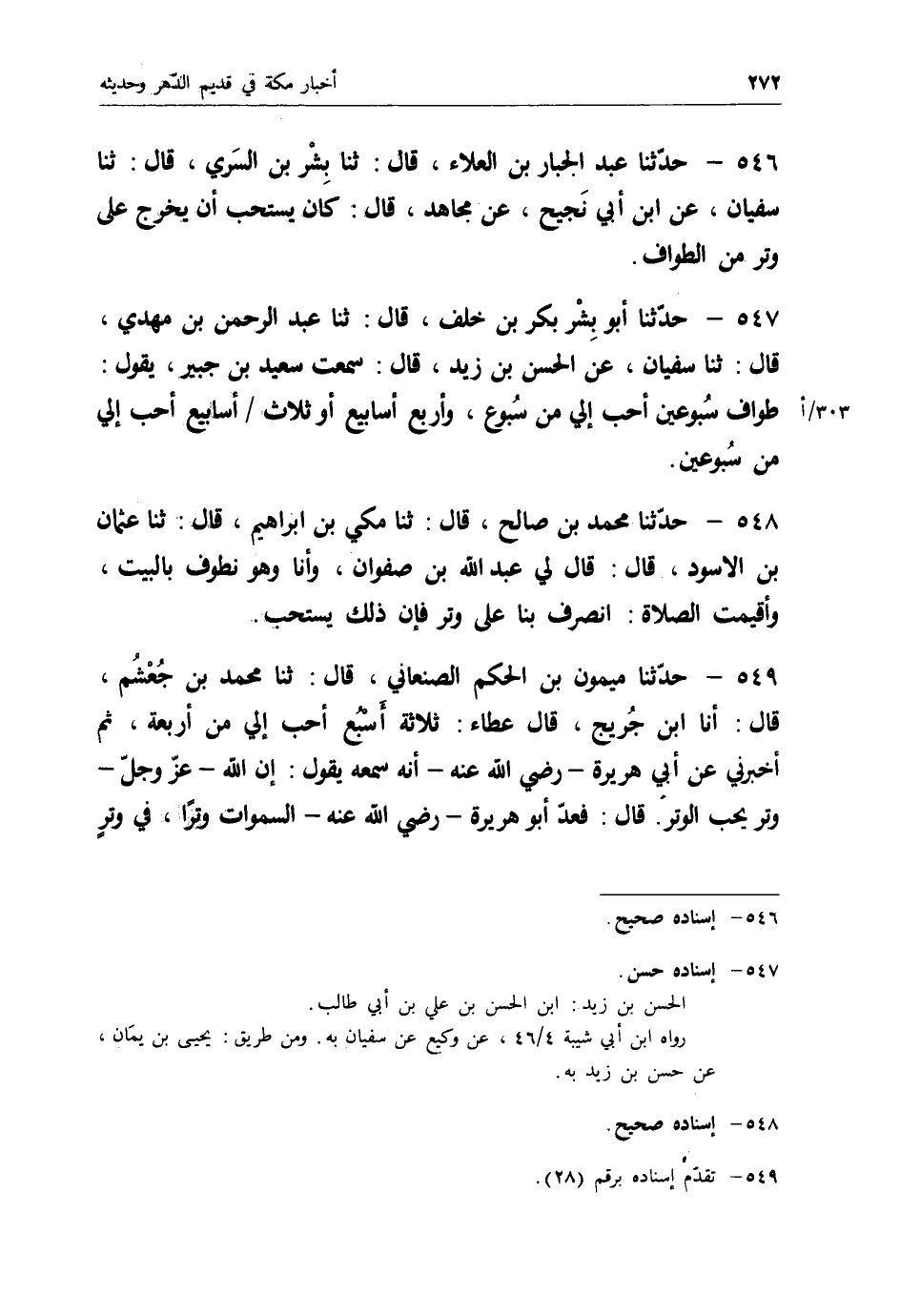 546 - حَدَّثَنَا عَبْدُ الْجَبَّارِ بْنُ الْعَلَاءِ قَالَ: ثنا بِشْرُ بْنُ السَّرِيِّ قَالَ: ثنا سُفْيَانُ، عَنِ ابْنِ أَبِي نَجِيحٍ، عَنْ مُجَاهِدٍ قَالَ: " كَانَ §يُسْتَحَبُّ أَنْ يَخْرُجَ عَلَى وِتْرٍ مِنَ الطَّوَافِ "