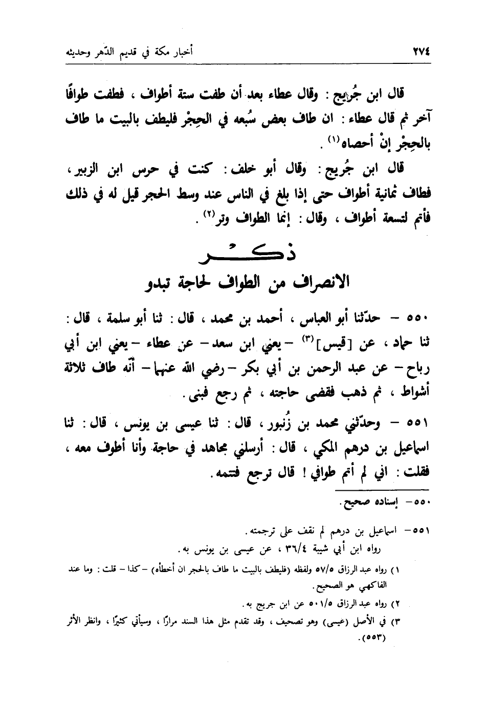551 - وَحَدَّثَنِي مُحَمَّدُ بْنُ زُنْبُورٍ قَالَ: ثنا عِيسَى بْنُ يُونُسَ قَالَ: ثنا إِسْمَاعِيلُ بْنُ دِرْهَمٍ الْمَكِّيُّ قَالَ: أَرْسَلَنِي مُجَاهِدٌ فِي حَاجَةٍ وَأَنَا أَطُوفُ مَعَهُ، فَقُلْتُ: إِنِّي §لَمْ أُتِمَّ طَوَافِي، قَالَ: " تَرْجِعُ فَتُتِمُّهُ "