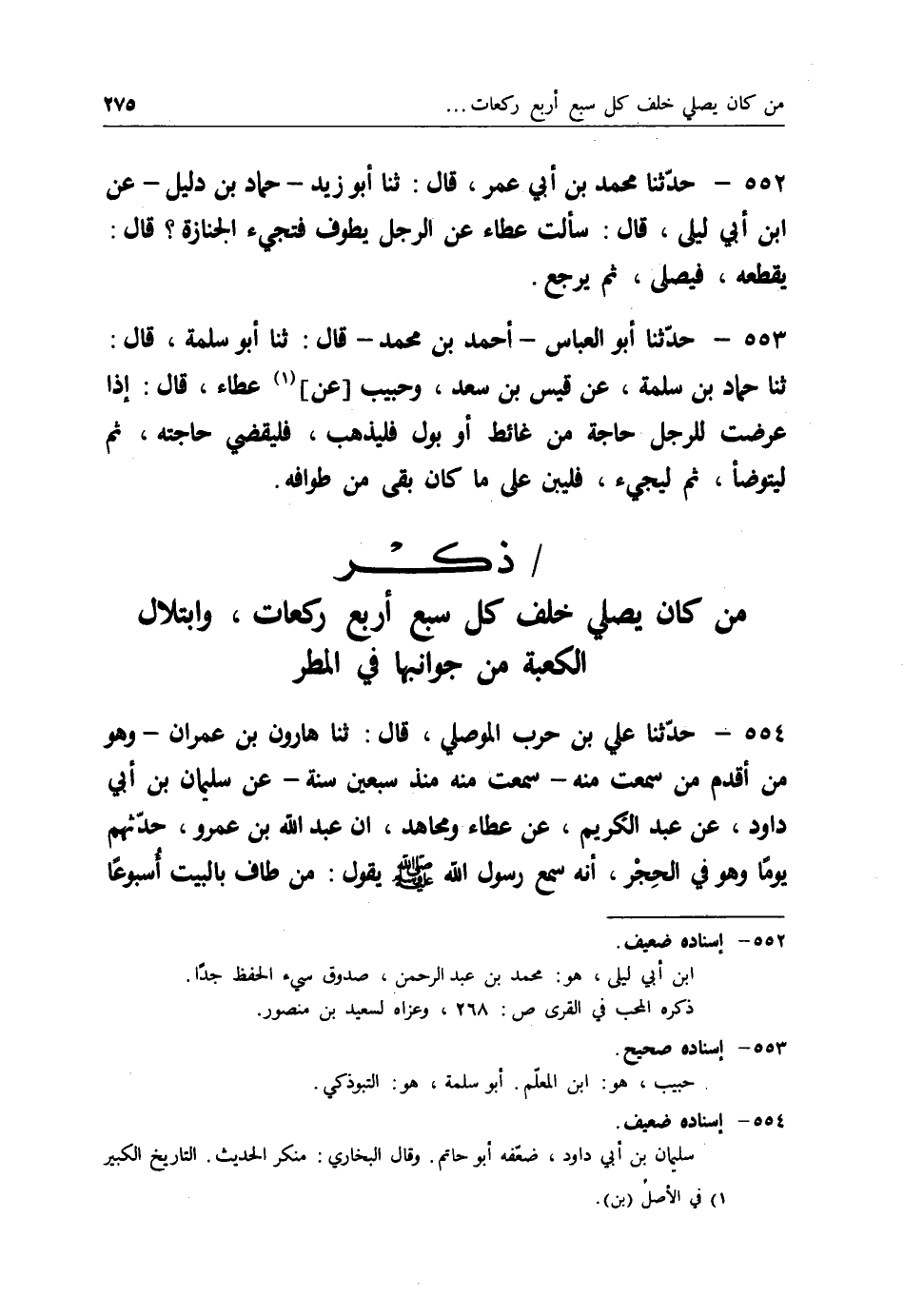 554 - حَدَّثَنَا عَلِيُّ بْنُ حَرْبٍ الْمَوْصِلِيُّ قَالَ: ثنا هَارُونُ بْنُ عِمْرَانَ، وَهُوَ مِنْ أَقْدَمِ مَنْ سَمِعْتُ مِنْهُ، سَمِعْتُ مِنْهُ مُنْذُ سَبْعِينَ سَنَةً، عَنْ سُلَيْمَانَ بْنِ أَبِي دَاوُدَ، عَنْ عَبْدِ الْكَرِيمِ، عَنْ عَطَاءٍ، وَمُجَاهِدٍ، أَنَّ عَبْدَ اللهِ بْنَ عَمْرٍو حَدَّثَهُمْ يَوْمًا، وَهُوَ فِي الْحِجْرِ، أَنَّهُ سَمِعَ رَسُولَ اللهِ صَلَّى اللَّهُ عَلَيْهِ وَسَلَّمَ يَقُولُ: " §مَنْ طَافَ بِالْبَيْتِ -[276]- أُسْبُوعًا ثُمَّ صَلَّى الرَّكْعَتَيْنِ أَوْ أَرْبَعَ رَكَعَاتٍ كَانَ لَهُ كَعَدْلِ عِتْقِ رَقَبَةٍ "