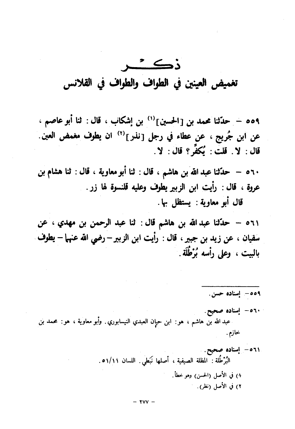 561 - حَدَّثَنَا عَبْدُ اللهِ بْنُ هَاشِمٍ قَالَ: ثنا عَبْدُ الرَّحْمَنِ بْنُ مَهْدِيٍّ، عَنْ سُفْيَانَ، عَنْ زَيْدِ بْنِ جُبَيْرٍ قَالَ: " رَأَيْتُ ابْنَ الزُّبَيْرِ رَضِيَ اللهُ عَنْهُمَا §يَطُوفُ بِالْبَيْتِ وَعَلَى رَأْسِهِ بُرْطُلَةٌ "