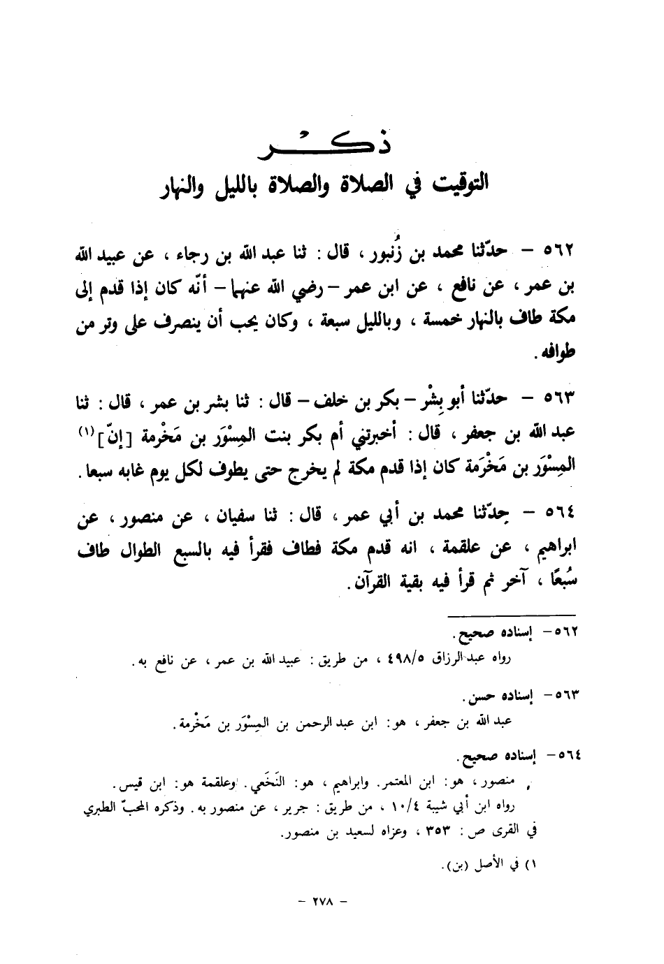 562 - حَدَّثَنَا مُحَمَّدُ بْنُ زُنْبُورٍ قَالَ: ثنا عَبْدُ اللهِ بْنُ رَجَاءٍ، عَنْ عُبَيْدِ اللهِ بْنِ عُمَرَ، عَنْ نَافِعٍ، عَنِ ابْنِ عُمَرَ رَضِيَ اللهُ عَنْهُمَا: أَنَّهُ " كَانَ §إِذَا قَدِمَ إِلَى مَكَّةَ طَافَ بِالنَّهَارِ خَمْسَةً، وَبِاللَّيْلِ سَبْعَةً، وَكَانَ يُحِبُّ أَنْ يَنْصَرِفَ عَلَى وِتْرٍ مِنْ طَوَافِهِ "
