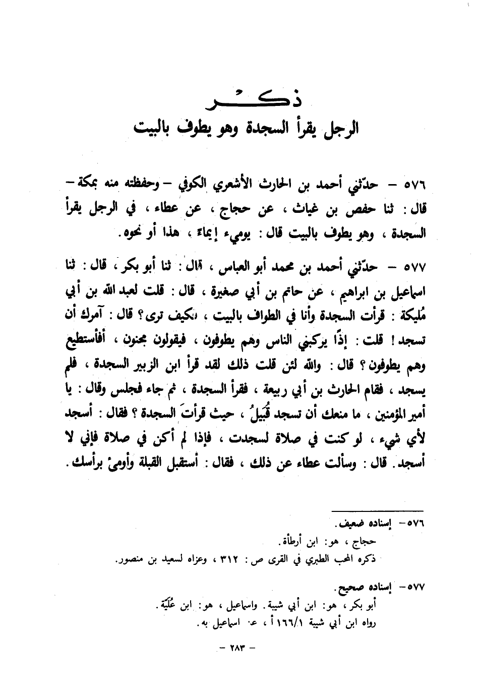 576 - حَدَّثَنِي أَحْمَدُ بْنُ الْحَارِثِ الْأَشْعَرِيُّ الْكُوفِيُّ، وَحَفِظْتُهُ مِنْهُ بِمَكَّةَ قَالَ: ثنا حَفْصُ بْنُ غِيَاثٍ، عَنْ حَجَّاجٍ عَنْ عَطَاءٍ، فِي §الرَّجُلِ يَقْرَأُ السَّجْدَةَ وَهُوَ يَطُوفُ بِالْبَيْتِ قَالَ: " يُومِئُ إِيمَاءً "، هَذَا أَوْ نَحْوَهُ "