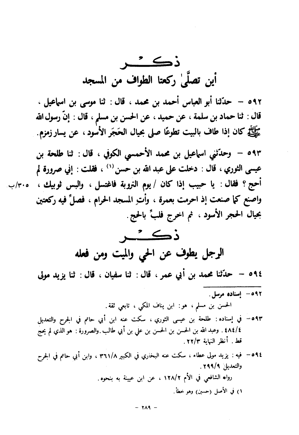 592 - حَدَّثَنَا أَبُو الْعَبَّاسِ أَحْمَدُ بْنُ مُحَمَّدٍ قَالَ: ثنا مُوسَى بْنُ إِسْمَاعِيلَ قَالَ: ثنا حَمَّادُ بْنُ سَلَمَةَ، عَنْ حُمَيْدٍ، عَنِ الْحَسَنِ بْنِ مُسْلِمٍ قَالَ: إِنَّ رَسُولَ اللهِ صَلَّى اللَّهُ عَلَيْهِ وَسَلَّمَ " كَانَ §إِذَا طَافَ بِالْبَيْتِ تَطَوُّعًا صَلَّى بِحِيَالِ الْحَجَرِ الْأَسْوَدِ عَنْ يَسَارِ زَمْزَمَ "