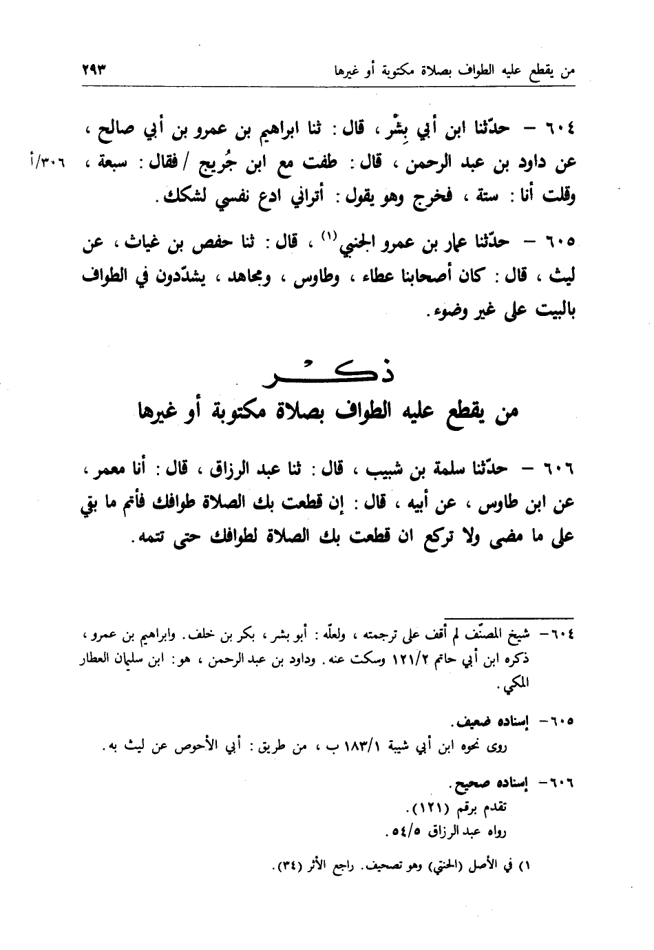 605 - حَدَّثَنَا عَمَّارُ بْنُ عَمْرٍو الْجَنْبِيُّ قَالَ: ثنا حَفْصُ بْنُ غِيَاثٍ، عَنْ لَيْثٍ قَالَ: " كَانَ أَصْحَابُنَا: عَطَاءٌ وَطَاوُسٌ وَمُجَاهِدٌ §يُشَدِّدُونَ فِي الطَّوَافِ بِالْبَيْتِ عَلَى غَيْرِ وُضُوءٍ "
