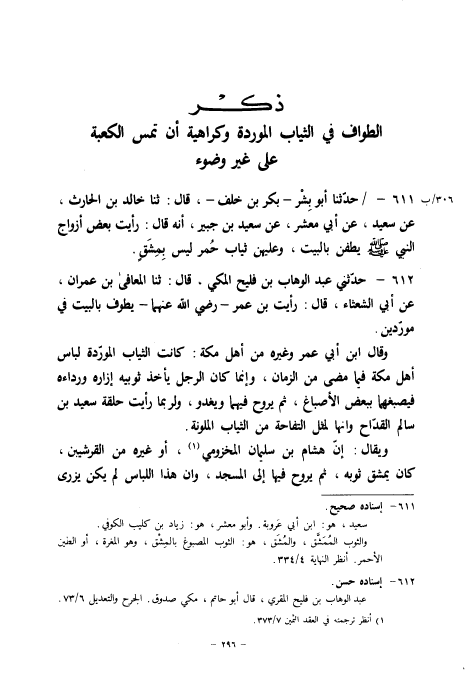 612 - حَدَّثَنِي عَبْدُ الْوَهَّابِ بْنُ فُلَيْحٍ الْمَكِّيُّ قَالَ: ثنا الْمُعَافَى بْنُ عِمْرَانَ، عَنْ أَبِي الشَّعْثَاءِ قَالَ: " رَأَيْتُ ابْنَ عُمَرَ رَضِيَ اللهُ عَنْهُمَا §يَطُوفُ بِالْبَيْتِ فِي مُوَرَّدَيْنِ " وَقَالَ ابْنُ أَبِي عُمَرَ وَغَيْرُهُ مِنْ أَهْلِ مَكَّةَ: كَانَتِ الثِّيَابُ الْمُوَرَّدَةُ لِبَاسَ أَهْلِ مَكَّةَ فِيمَا مَضَى مِنَ الزَّمَانِ، وَإِنَّمَا كَانَ الرَّجُلُ يَأْخُذُ ثَوْبَيْهِ إِزَارَهُ وَرِدَاءَهُ فَيَصْبِغُهُمَا بِبَعْضِ الْأَصْبَاغِ ثُمَّ يَرُوحُ فِيهِمَا وَيَغْدُو، وَلَرُبَّمَا رَأَيْتُ حَلْقَةَ سَعِيدِ بْنِ سَالِمٍ الْقَدَّاحِ، وَإِنَّهَا لَمِثْلُ التُّفَّاحَةِ مِنَ الثِّيَابِ الْمُلَوَّنَةِ. وَيُقَالُ إِنَّ هِشَامَ بْنَ سُلَيْمَانَ الْمَخْزُومِيَّ أَوْ غَيْرَهُ مِنَ الْقُرَشِيِّينَ، كَانَ يَمْشُقُ ثَوْبَهُ ثُمَّ يَرُوحُ فِيهَا إِلَى الْمَسْجِدِ، وَإِنَّ هَذَا اللِّبَاسَ لَمْ يَكُنْ -[297]- يُزْرَى بِالنَّاسِ، وَلَا بِبَعْضِهِمْ عَنْ حَالِ الْمُرُوءَةِ عِنْدَهُمْ، وَلَا يُنْكِرُونَهُ، وَإِنَّ ذَلِكَ كَانَ سَبِيلَهُمْ يُرِيدُونَ بِهِ الرِّفْقَ فِي الْمَعَاشِ، وَقَدْ مَضَى رَجُلٌ مِنْ بَنِي جُمَحٍ عَلَى مَكَّةَ وَهُوَ يَلْبَسُ هَذِهِ الثِّيَابَ