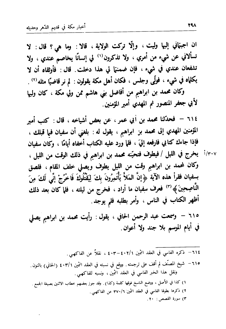 614 - فَحَدَّثَنَا مُحَمَّدُ بْنُ أَبِي عُمَرَ، عَنْ بَعْضِ، أَشْيَاخِهِ , قَالَ: " كَتَبَ أَمِيرُ الْمُؤْمِنِينَ الْمَهْدِيُّ إِلَى مُحَمَّدِ بْنِ إِبْرَاهِيمَ , يَقُولُ لَهُ: بَلَغَنِي أَنَّ سُفْيَانَ فِيمَا قِبَلَكَ , فَإِذَا جَاءَكَ كِتَابِي فَارْفَعْهُ إِلَيَّ , فَلَمَّا وَرَدَ عَلَيْهِ الْكِتَابُ أَخْفَاهُ أَيَّامًا , وَكَانَ سُفْيَانُ يَخْرُجُ فِي اللَّيْلِ فَيَطُوفُ فَتَحَيَّنَهُ مُحَمَّدُ بْنُ إِبْرَاهِيمَ فِي ذَلِكَ الْوَقْتِ مِنَ اللَّيْلِ , وَكَانَ لِمُحَمَّدِ بْنِ إِبْرَاهِيمَ وَقْتٌ مِنَ اللَّيْلِ يَطُوفُ وَيُصَلِّي خَلْفَ الْمَقَامِ , فَلَصِقَ بِسُفْيَانَ فَقَرَأَ هَذِهِ الْآيَةَ {§إِنَّ الْمَلَأَ يَأْتَمِرُونَ بِكَ لِيَقْتُلُوكَ فَاخْرُجْ إِنِّي لَكَ مِنَ النَّاصِحِينَ} [القصص: 20] فَعَرَفَ سُفْيَانُ مَا أَرَادَ فَخَرَجَ مِنْ لَيْلَتِهِ , فَلَمَّا كَانَ بَعْدَ ذَلِكَ أَظْهَرَ الْكِتَابَ فِي النَّاسِ , وَأَمَرَ بِطَلَبِهِ فَلَمْ يُوجَدْ "