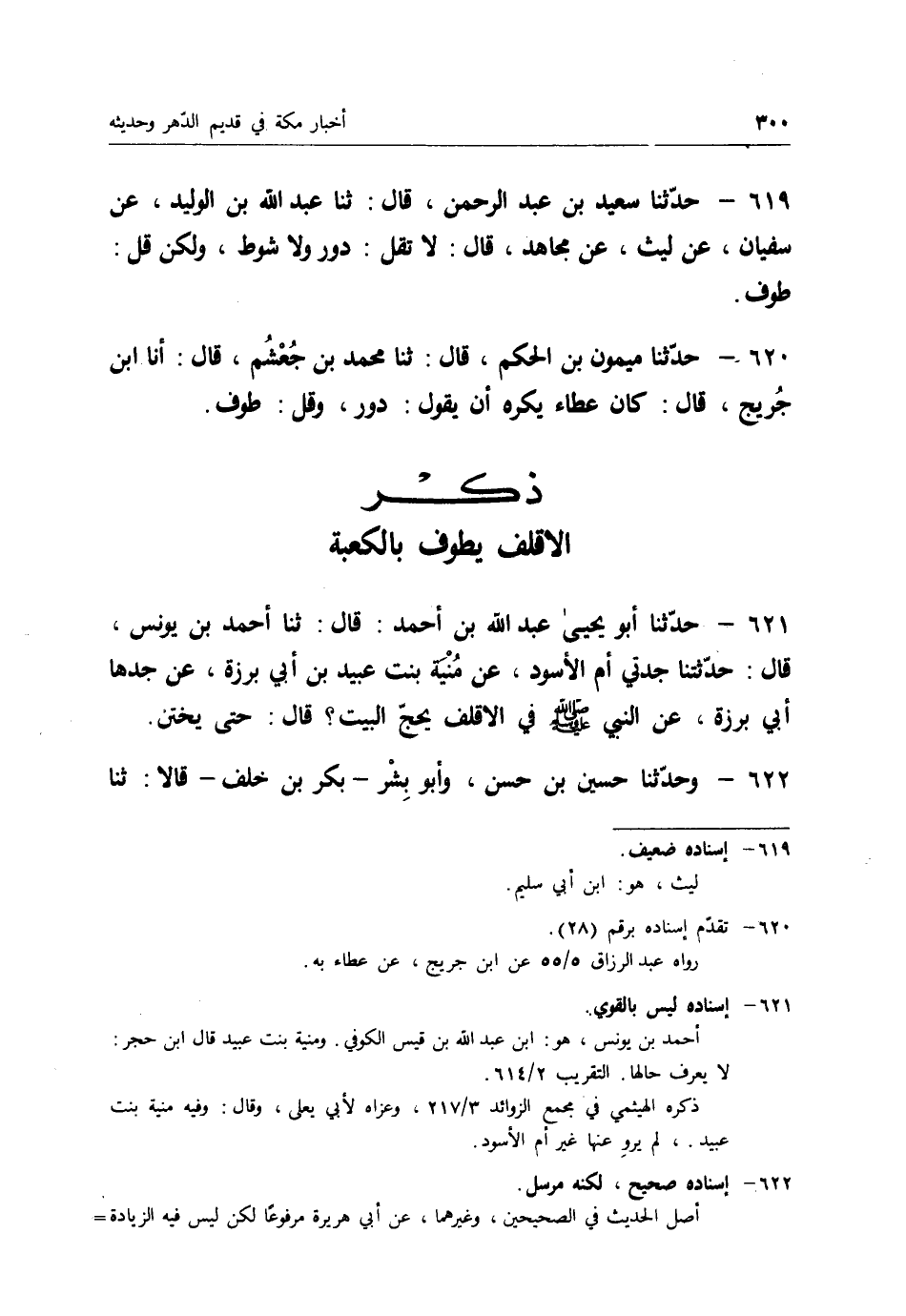 620 - حَدَّثَنَا مَيْمُونُ بْنُ الْحَكَمِ قَالَ: ثنا مُحَمَّدُ بْنُ جُعْشُمٍ قَالَ: أنا ابْنُ جُرَيْجٍ قَالَ: " كَانَ عَطَاءٌ §يَكْرَهُ أَنْ يَقُولَ: دَوْرٌ , وَقُلْ: طَوْفٌ "