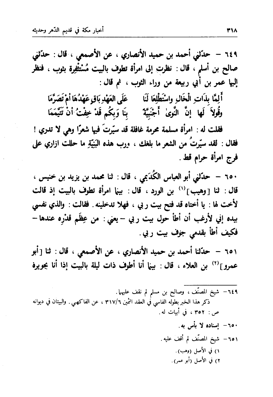 649 - حَدَّثَنِي أَحْمَدُ بْنُ حُمَيْدٍ الْأَنْصَارِيُّ، عَنِ الْأَصْمَعِيِّ قَالَ: حَدَّثَنِي صَالِحُ بْنُ أَسْلَمَ، قَالَ: نَظَرْتُ إِلَى امْرَأَةٍ تَطُوفُ بِالْبَيْتِ مُسْتَثْفِرَةً بِثَوْبٍ، فَنَظَرَ إِلَيْهَا عُمَرُ بْنُ أَبِي رَبِيعَةَ مِنْ وَرَاءِ الثَّوْبِ ثُمَّ قَالَ: