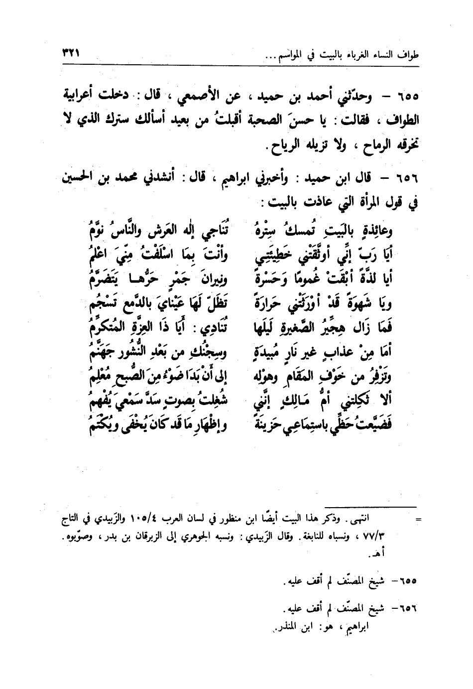656 - قَالَ ابْنُ حُمَيْدٍ: وَأَخْبَرَنِي إِبْرَاهِيمُ قَالَ: أَنْشَدَنِي مُحَمَّدُ بْنُ الْحُسَيْنِ فِي قَوْلِ الْمَرْأَةِ الَّتِي عَاذَتْ بِالْبَيْتِ: "