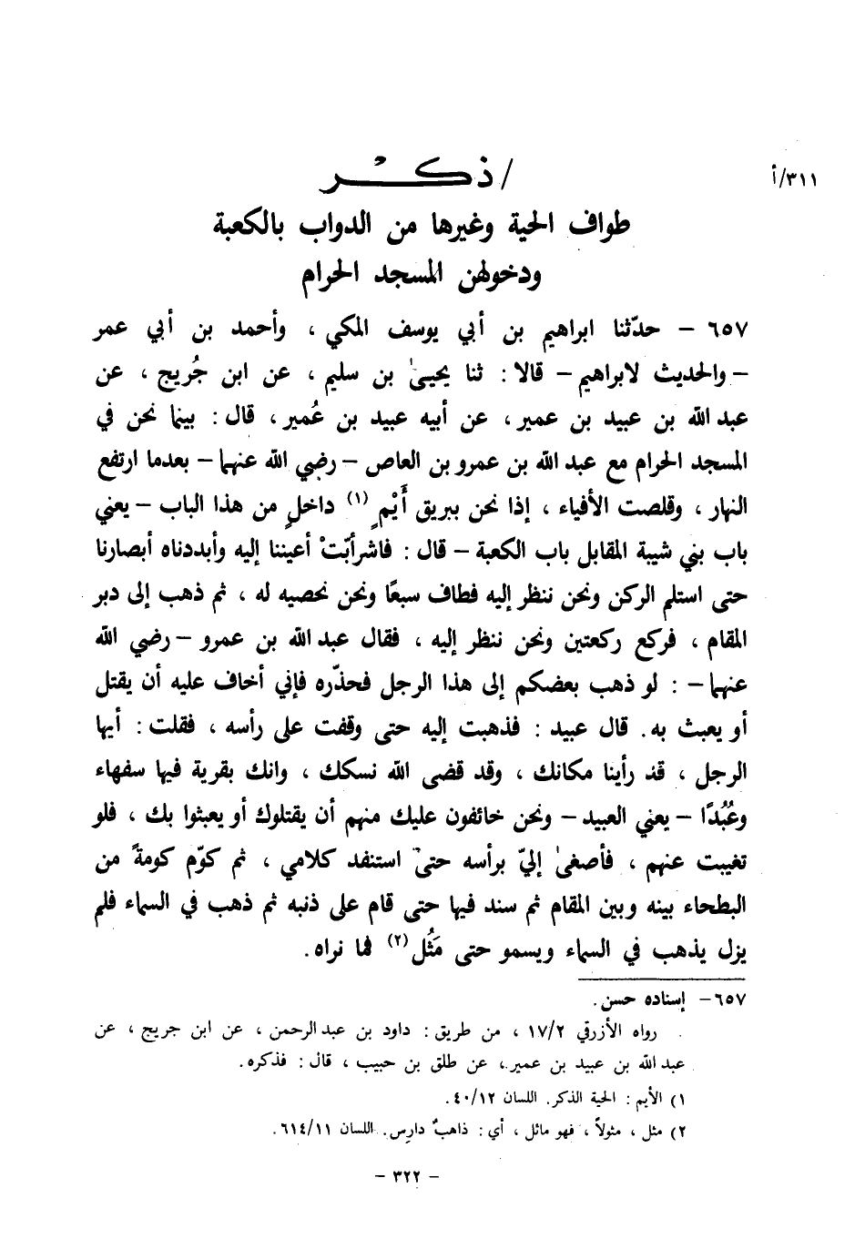 657 - حَدَّثَنَا إِبْرَاهِيمُ بْنُ أَبِي يُوسُفَ الْمَكِّيُّ، وَأَحْمَدُ بْنُ أَبِي عُمَرَ، وَالْحَدِيثُ لِإِبْرَاهِيمَ، قَالَا: ثنا يَحْيَى بْنُ سُلَيْمٍ، عَنِ ابْنِ جُرَيْجٍ، عَنْ عَبْدِ اللهِ بْنِ عُبَيْدِ بْنِ عُمَيْرٍ، عَنْ أَبِيهِ عُبَيْدِ بْنِ عُمَيْرٍ قَالَ: بَيْنَمَا نَحْنُ فِي الْمَسْجِدِ الْحَرَامِ مَعَ عَبْدِ اللهِ بْنِ عَمْرِو بْنِ الْعَاصِ رَضِيَ اللهُ عَنْهُمَا، بَعْدَمَا ارْتَفَعَ النَّهَارُ، وَقَلَّصَتِ الْأَفْيَاءُ، إِذَا نَحْنُ بِبَرِيقِ أَيْمٍ دَاخِلٍ مِنْ هَذَا الْبَابِ، يَعْنِي بَابَ بَنِي شَيْبَةَ الْمُقَابِلَ بَابَ الْكَعْبَةِ قَالَ: فَاشْرَأَبَّتْ أَعْيُنُنَا إِلَيْهِ، وَأَبْدَدْنَاهُ أَبْصَارَنَا، حَتَّى اسْتَلَمَ الرُّكْنَ وَنَحْنُ نَنْظُرُ إِلَيْهِ، فَطَافَ سَبْعًا وَنَحْنُ نُحْصِيهِ لَهُ، ثُمَّ ذَهَبَ إِلَى دُبُرِ الْمَقَامِ، فَرَكَعَ رَكْعَتَيْنِ وَنَحْنُ نَنْظُرُ إِلَيْهِ، فَقَالَ عَبْدُ اللهِ بْنُ عَمْرٍو رَضِيَ اللهُ عَنْهُمَا: " لَوْ ذَهَبَ بَعْضُكُمْ إِلَى هَذَا الرَّجُلِ فَحَذَّرَهُ فَإِنِّي أَخَافُ عَلَيْهِ أَنْ يُقْتَلَ أَوْ يُعْبَثَ بِهِ "، قَالَ عُبَيْدٌ: فَذَهَبْتُ إِلَيْهِ حَتَّى وَقَفْتُ عَلَى رَأْسِهِ فَقُلْتُ: أَيُّهَا الرَّجُلُ، قَدْ رَأَيْنَا مَكَانَكَ، وَقَدْ §قَضَى اللهُ نُسُكَكَ وَإِنَّكَ بِقَرْيَةٍ فِيهَا سُفَهَاءُ وَعُبُدٌ، يَعْنِي الْعَبِيدَ، وَنَحْنُ خَائِفُونَ عَلَيْكَ مِنْهُمْ أَنْ يَقْتُلُوكَ أَوْ يَعْبَثُوا بِكَ، فَلَوْ تَغَيَّبْتَ عَنْهُمْ، فَأَصْغَى إِلَيَّ بِرَأْسِهِ حَتَّى اسْتَنْفَدَ كَلَامِي، ثُمَّ كَوَّمَ كَوْمَةً مِنْ الْبَطْحَاءِ بَيْنَهُ وَبَيْنَ الْمَقَامِ، ثُمَّ سَنَدَ فِيهَا حَتَّى قَامَ عَلَى ذَنَبِهِ ثُمَّ ذَهَبَ فِي السَّمَاءِ فَلَمْ يَزَلْ يَذْهَبُ فِي السَّمَاءِ وَيَسْمُو حَتَّى مَثُلَ فَمَا نَرَاهُ