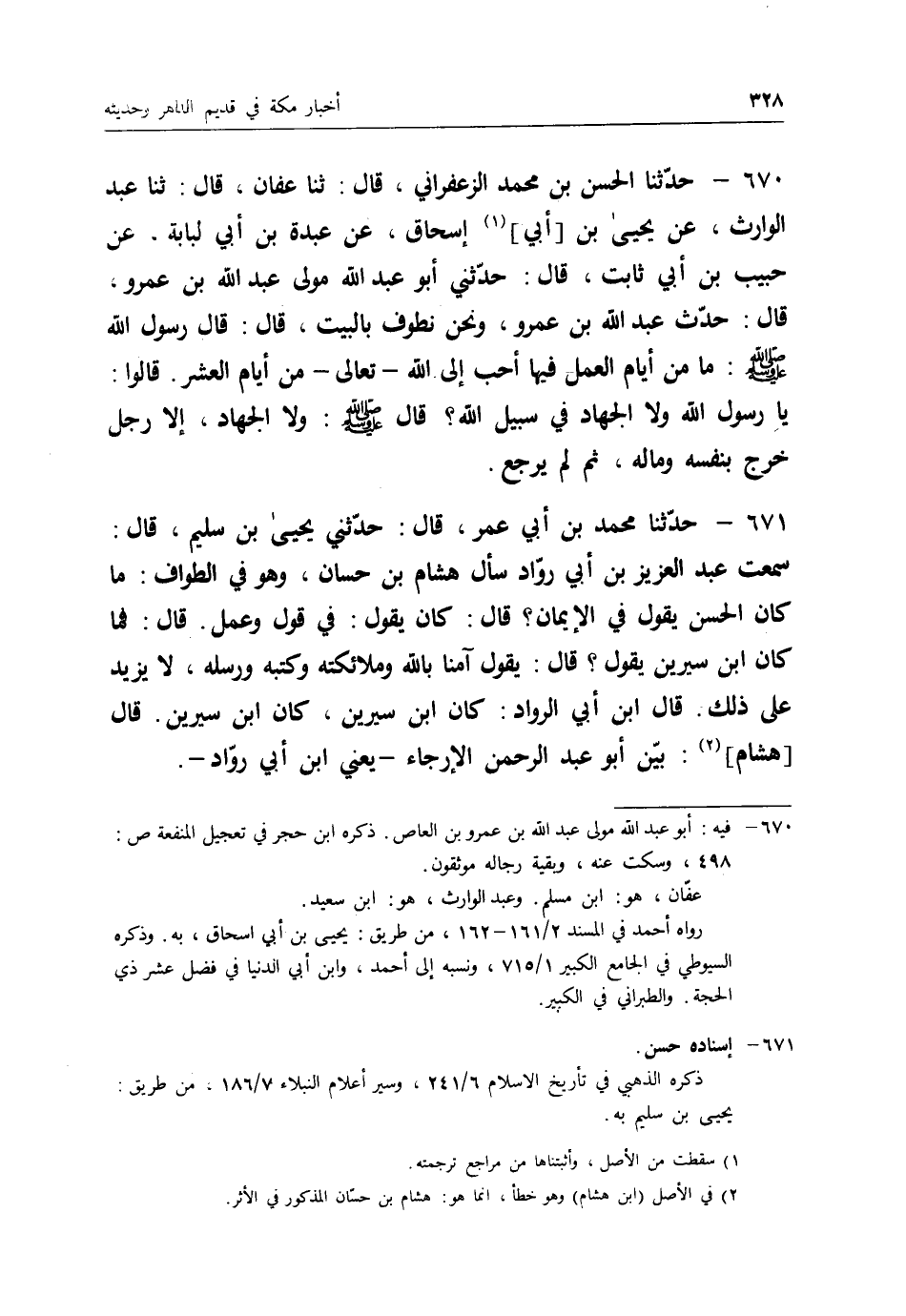 671 - حَدَّثَنَا مُحَمَّدُ بْنُ أَبِي عُمَرَ قَالَ: حَدَّثَنِي يَحْيَى بْنُ سُلَيْمٍ قَالَ: سَمِعْتُ عَبْدَ الْعَزِيزِ بْنَ أَبِي رَوَّادٍ، سَأَلَ هِشَامَ بْنَ حَسَّانَ، وَهُوَ فِي الطَّوَافِ: §مَا كَانَ الْحَسَنُ يَقُولُ فِي الْإِيمَانِ؟ قَالَ: " كَانَ يَقُولُ: فِي قَوْلٍ وَعَمَلٍ "، قَالَ: فَمَا كَانَ ابْنُ سِيرِينَ يَقُولُ؟ قَالَ: " يَقُولُ: آمَنَّا بِاللهِ وَمَلَائِكَتِهِ وَكُتُبِهِ وَرُسُلِهِ لَا يَزِيدُ عَلَى ذَلِكَ " قَالَ ابْنُ أَبِي الرَّوَّادِ: كَانَ ابْنُ سِيرِينَ، كَانَ ابْنُ سِيرِينَ. قَالَ: " هِشَامٌ بَيَّنَ أَبُو عَبْدِ الرَّحْمَنِ الْإِرْجَاءَ، يَعْنِي ابْنَ أَبِي رَوَّادٍ "