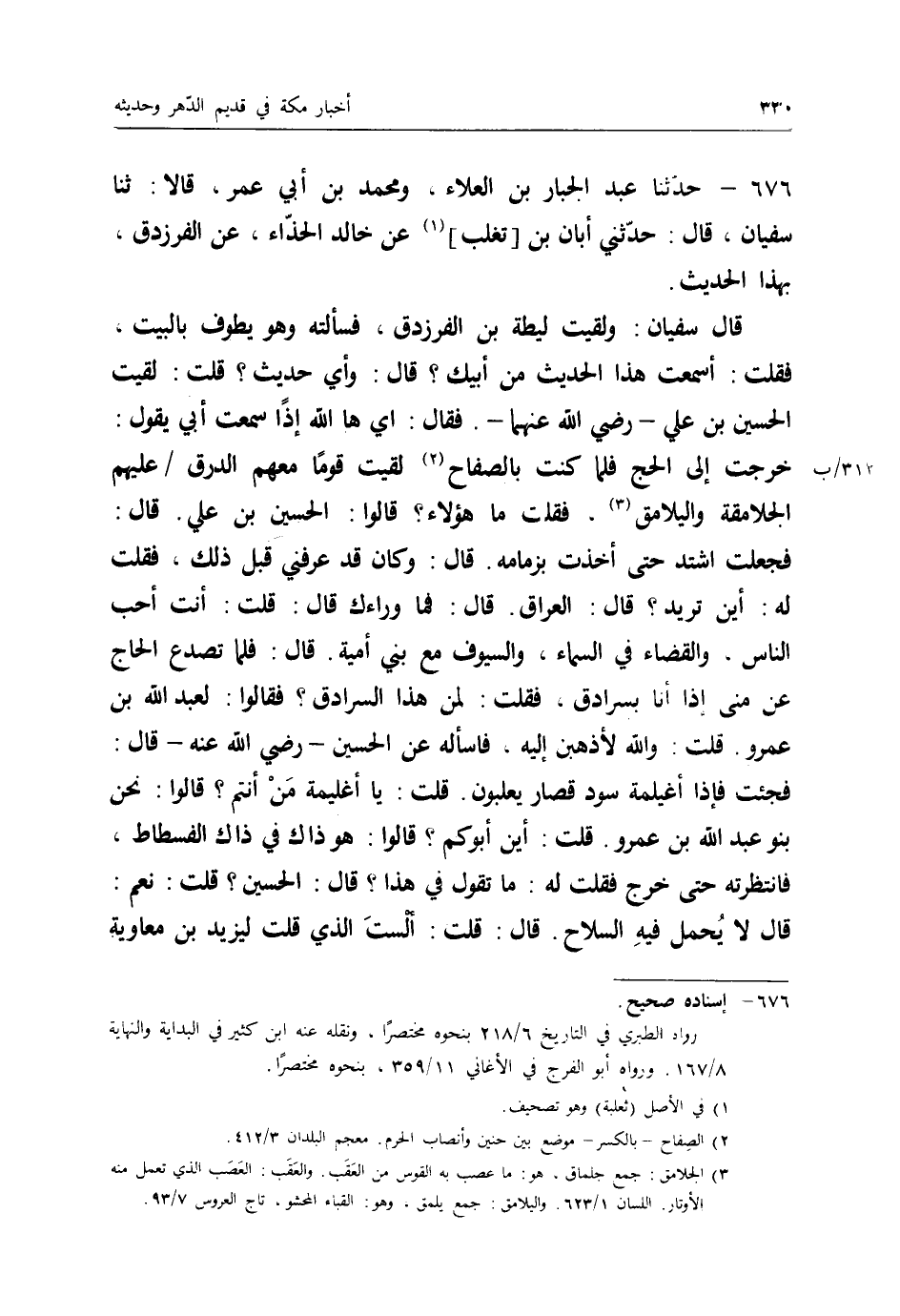 676 - حَدَّثَنَا عَبْدُ الْجَبَّارِ بْنُ الْعَلَاءِ، وَمُحَمَّدُ بْنُ أَبِي عُمَرَ، قَالَا: ثنا سُفْيَانُ قَالَ: حَدَّثَنِي أَبَانُ بْنُ تَغْلِبَ، عَنْ خَالِدٍ الْحَذَّاءِ، عَنِ الْفَرَزْدَقِ، بِهَذَا الْحَدِيثِ قَالَ سُفْيَانُ: وَلَقِيتُ لَبَطَةَ بْنَ الْفَرَزْدَقِ، فَسَأَلْتُهُ، وَهُوَ يَطُوفُ بِالْبَيْتِ، فَقُلْتُ أَسَمِعْتَ هَذَا الْحَدِيثَ مِنْ أَبِيكَ؟ قَالَ: وَأَيُّ حَدِيثٍ؟ قُلْتُ: لَقِيتُ الْحُسَيْنَ بْنَ عَلِيٍّ رَضِيَ اللهُ عَنْهُمَا، فَقَالَ إِي هَا اللهِ إِذًا سَمِعْتُ أَبِي يَقُولُ: " خَرَجْتُ إِلَى الْحَجِّ فَلَمَّا كُنْتُ بِالصِّفَاحِ لَقِيتُ قَوْمًا مَعَهُمُ الدَّرَقُ عَلَيْهِمُ الْجَلَامِقَةُ وَالْيَلَامِقُ، فَقُلْتُ: مَا هَؤُلَاءِ؟ قَالُوا: الْحُسَيْنُ بْنُ عَلِيٍّ قَالَ: فَجَعَلْتُ أَشْتَدُّ حَتَّى أَخَذْتُ بِزِمَامِهِ، قَالَ: وَكَانَ قَدْ عَرَفَنِي قَبْلَ ذَلِكَ، فَقُلْتُ لَهُ: أَيْنَ تُرِيدُ؟ قَالَ: الْعِرَاقَ قَالَ: فَمَا وَرَاءَكَ؟ قَالَ: قُلْتُ: أَنْتَ أَحَبُّ النَّاسِ، §وَالْقَضَاءُ فِي السَّمَاءِ، وَالسُّيُوفُ مَعَ بَنِي أُمَيَّةَ قَالَ: فَلَمَّا تَصَدَّعَ الْحَاجُّ عَنْ مِنًى إِذَا أَنَا بِسُرَادِقٍ، فَقُلْتُ: لِمَنْ هَذَا السُّرَادِقُ؟ فَقَالُوا: لِعَبْدِ اللِّهِ بْنِ عَمْرٍو، قُلْتُ: وَاللهِ لَأَذْهَبَنَّ إِلَيْهِ فَأَسْأَلُهُ عَنِ الْحُسَيْنِ رَضِيَ اللهُ عَنْهُ، قَالَ: فَجِئْتُ فَإِذَا أُغَيْلِمَةٌ سُودٌ قِصَارٌ يَلْعَبُونَ، قُلْتُ: يَا أُغَيْلِمَةُ مَنْ أَنْتُمْ؟ قَالُوا: نَحْنُ بَنُو عَبْدِ اللهِ بْنِ عَمْرٍو، قُلْتُ: أَيْنَ أَبُوكُمْ؟ قَالُوا: هُوَ ذَاكَ فِي ذَاكَ الْفُسْطَاطِ، فَانْتَظَرْتُهُ حَتَّى خَرَجَ، فَقُلْتُ لَهُ: مَا تَقُولُ فِي هَذَا؟ قَالَ: الْحُسَيْنُ؟ قُلْتُ: نَعَمْ، قَالَ: لَا يُحْمَلُ فِيهِ السِّلَاحُ، قَالَ: قُلْتُ: أَلَسْتَ الَّذِي قُلْتَ لِيَزِيدَ بْنِ مُعَاوِيَةَ -[331]- كَذَا وَكَذَا؟ قَالَ: فَسَبَّنِي فَسَبَبْتُهُ، فَقَالَ: مَا مَثَلُهُ إِلَّا مَثَلُ مُوسَى حِينَ خَرَجَ فَارًّا مِنْ آلِ فِرْعَوْنَ قَالَ: ثُمَّ صَدَرْتُ فَذَهَبْتُ إِلَى مَاءٍ يُقَالُ لَهُ: تِعْشَارٌ، وَقَالَ ابْنُ أَبِي عَمْرٍو: وَكُنْتُ أَحْفَظُ لِسُفْيَانَ فَنَزَلْتُ عَلَيْهِ، وَكَانَتِ الْعِيرُ يَنْزِلُونَ بِذَلِكَ الْمَاءِ، فَإِذَا نَزَلَتِ اسْتَقْبَلَهُمُ النَّاسُ، فَسَأَلُوهُمْ عَنِ الْخَبَرِ، فَرَأَيْتُ عِيرًا نَزَلَتْ فَنَادَيْتُهُمْ، قُلْتُ: مَا فَعَلَ الْحُسَيْنُ بْنُ عَلِيٍّ؟ قَالُوا: قُتِلَ، قُلْتُ: فَعَلَ اللهُ بِعَبْدِ اللهِ بْنِ عَمْرٍو، وَفَعَلَ "
