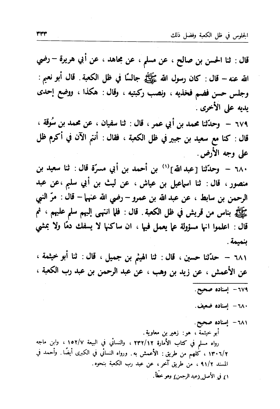 681 - حَدَّثَنَا حُسَيْنٌ قَالَ: ثنا الْهَيْثَمُ بْنُ جَمِيلٍ قَالَ: ثنا أَبُو خَيْثَمَةَ، عَنِ الْأَعْمَشِ، عَنْ زَيْدِ بْنِ وَهْبٍ، عَنْ عَبْدِ الرَّحْمَنِ بْنِ عَبْدِ رَبِّ الْكَعْبَةِ -[334]- قَالَ: " دَخَلْتُ الْمَسْجِدَ الْحَرَامَ فَإِذَا أَنَا بِعَبْدِ اللهِ بْنِ عَمْرِو بْنِ الْعَاصِ رَضِيَ اللهُ عَنْهُمَا §فِي ظِلِّ الْكَعْبَةِ يُحَدِّثُ "