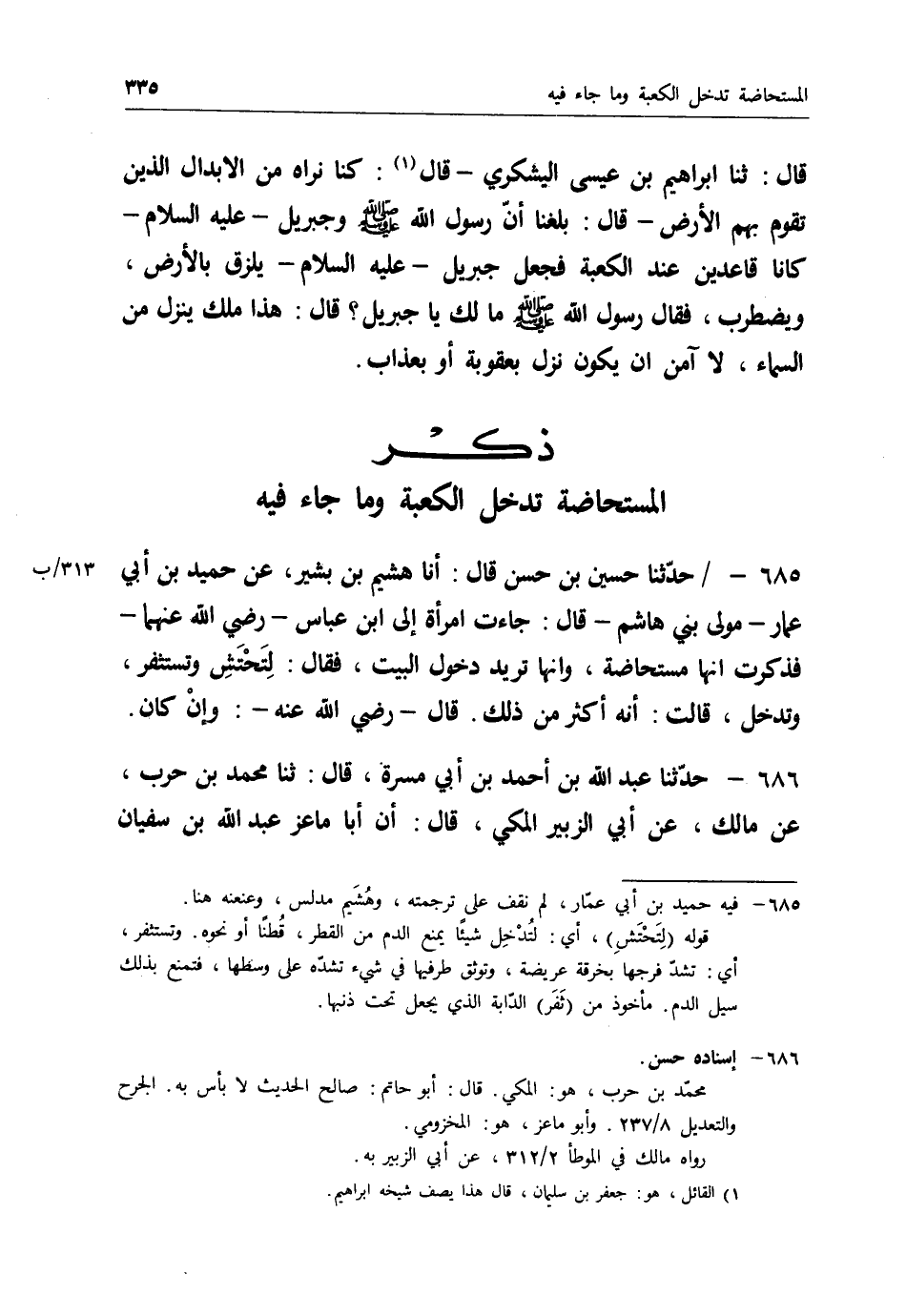 686 - حَدَّثَنَا عَبْدُ اللهِ بْنُ أَحْمَدَ بْنِ أَبِي مَسَرَّةَ قَالَ: ثنا مُحَمَّدُ بْنُ حَرْبٍ، عَنْ مَالِكٍ، عَنْ أَبِي الزُّبَيْرِ الْمَكِّيِّ قَالَ: إِنَّ أَبَا مَاعِزٍ عَبْدَ اللهِ بْنَ سُفْيَانَ -[336]- حَدَّثَهُ: أَنَّهُ كَانَ جَالِسًا مَعَ عَبْدِ اللهِ بْنِ عُمَرَ رَضِيَ اللهُ عَنْهُمَا، فَجَاءَتْهُ امْرَأَةٌ تَسْتَفْتِيهِ، فَقَالَتْ: إِنِّي أَقْبَلْتُ أُرِيدُ الطَّوَافَ بِالْبَيْتِ حَتَّى إِذَا كُنْتُ عِنْدَ بَابِ الْمَسْجِدِ أُهْرِقَتِ الدِّمَاءُ، فَقَالَ عَبْدُ اللهِ بْنُ عُمَرَ رَضِيَ اللهُ عَنْهُمَا: " إِنَّمَا §ذَلِكَ رَكْضَةٌ مِنَ الشَّيْطَانِ، اغْتَسِلِي ثُمَّ اسْتَثْفِرِي بِثَوْبٍ وَصَلِّي "