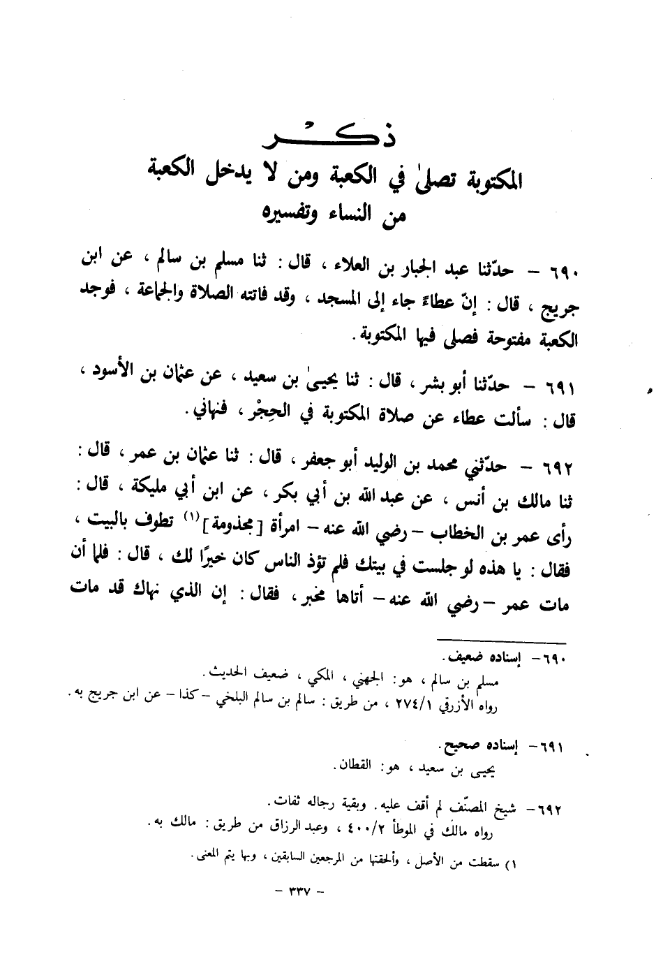 691 - حَدَّثَنَا أَبُو بِشْرٍ قَالَ: ثنا يَحْيَى بْنُ سَعِيدٍ، عَنْ عُثْمَانَ بْنِ الْأَسْوَدِ قَالَ: " §سَأَلْتُ عَطَاءً عَنْ صَلَاةِ الْمَكْتُوبَةِ فِي الْحِجْرِ فَنَهَانِي "