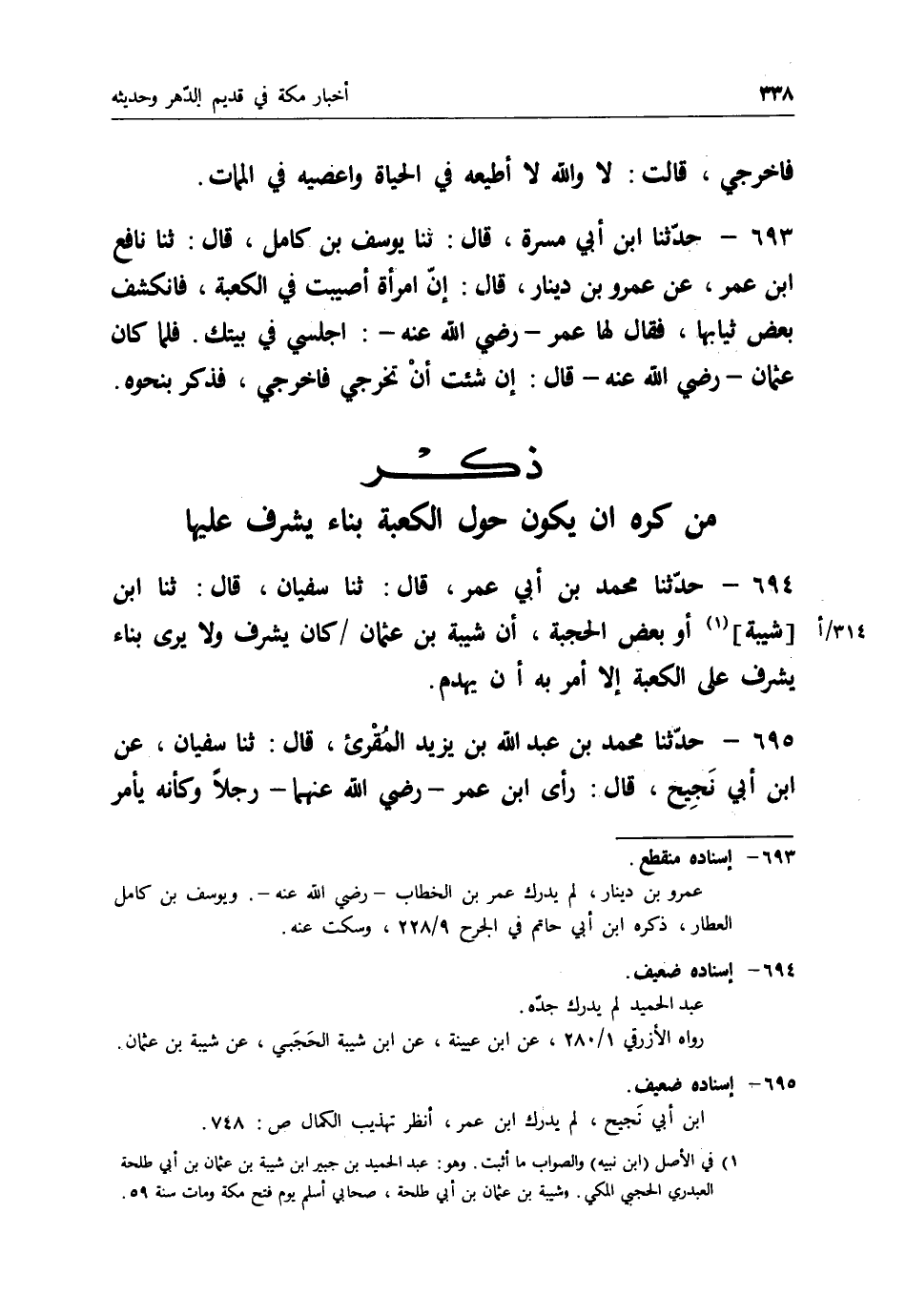 694 - حَدَّثَنَا مُحَمَّدُ بْنُ أَبِي عُمَرَ قَالَ: ثنا سُفْيَانُ قَالَ: ثنا ابْنُ شَيْبَةَ، أَوْ بَعْضُ الْحَجَبَةِ: أَنَّ شَيْبَةَ بْنَ عُثْمَانَ " كَانَ يُشْرِفُ §وَلَا يَرَى بِنَاءً يُشْرِفُ عَلَى الْكَعْبَةِ إِلَّا أَمَرَ بِهِ أَنْ يُهْدَمَ "