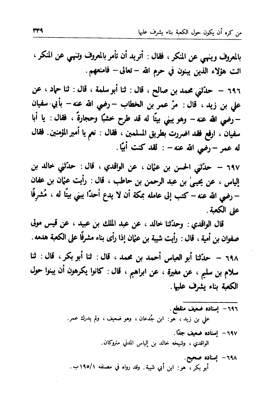 697 - حَدَّثَنِي الْحَسَنُ بْنُ عُثْمَانَ، عَنِ الْوَاقِدِيِّ قَالَ: حَدَّثَنِي خَالِدُ بْنُ إِلْيَاسَ، عَنْ يَحْيَى بْنِ عَبْدِ الرَّحْمَنِ بْنِ حَاطِبٍ قَالَ: رَأَيْتُ عُثْمَانَ بْنَ عَفَّانَ رَضِيَ اللهُ عَنْهُ كَتَبَ إِلَى عَامِلِهِ بِمَكَّةَ أَنْ " §لَا يَدَعَ أَحَدًا يَبْنِي بَيْتًا لَهُ مُشْرِفًا عَلَى الْكَعْبَةِ "